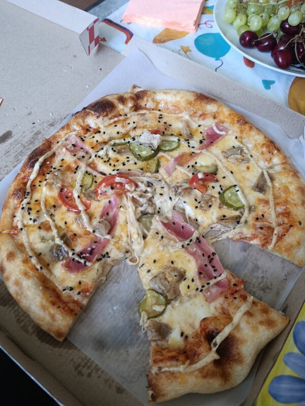 Доставили минут за 40. Пицца просто огонь! Вкусная, горячая, сочная, много сыра! Можно было бы салфетки положить, а так всё отлично! Рекомендую!