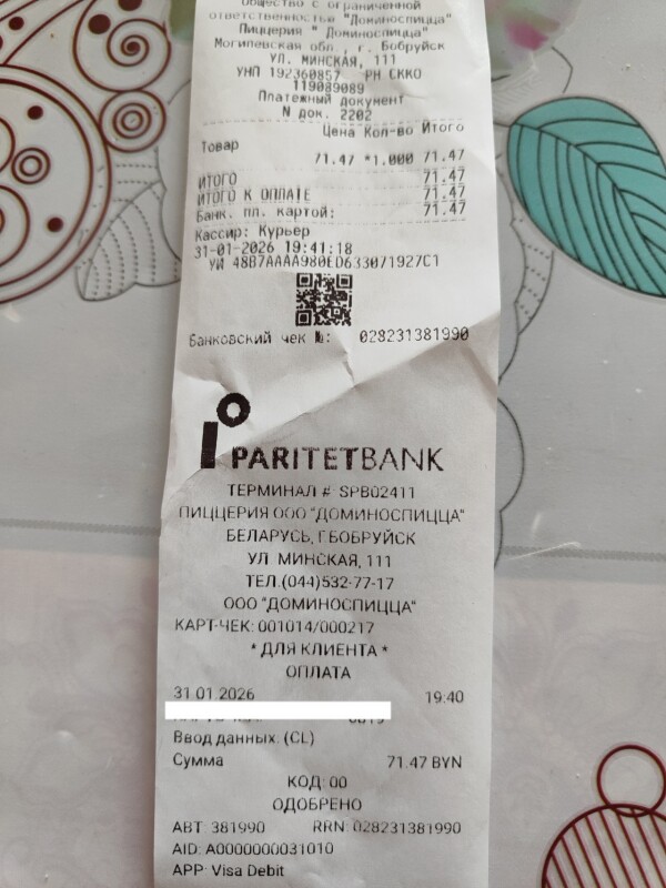 Привезли быстро заказ.Пицца горячая,не смотря на мороз минус 27.Пицца 🍕 очень вкусная,начинка супер,края пиццы хрустящие и воздушные.