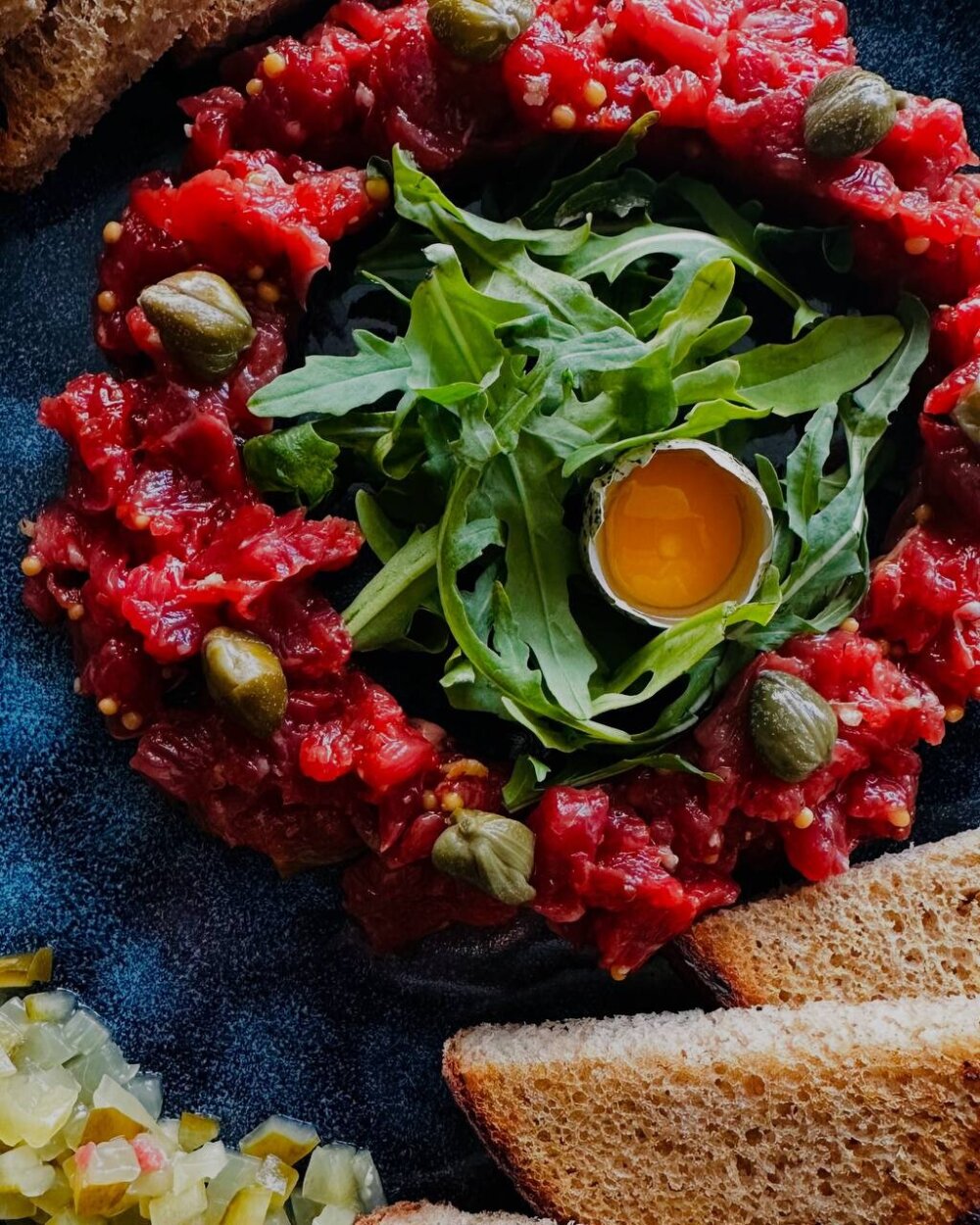 Говядина, корнишоны, яйцо перепелиное, лук, микс салата, рукола, заправка, хлеб