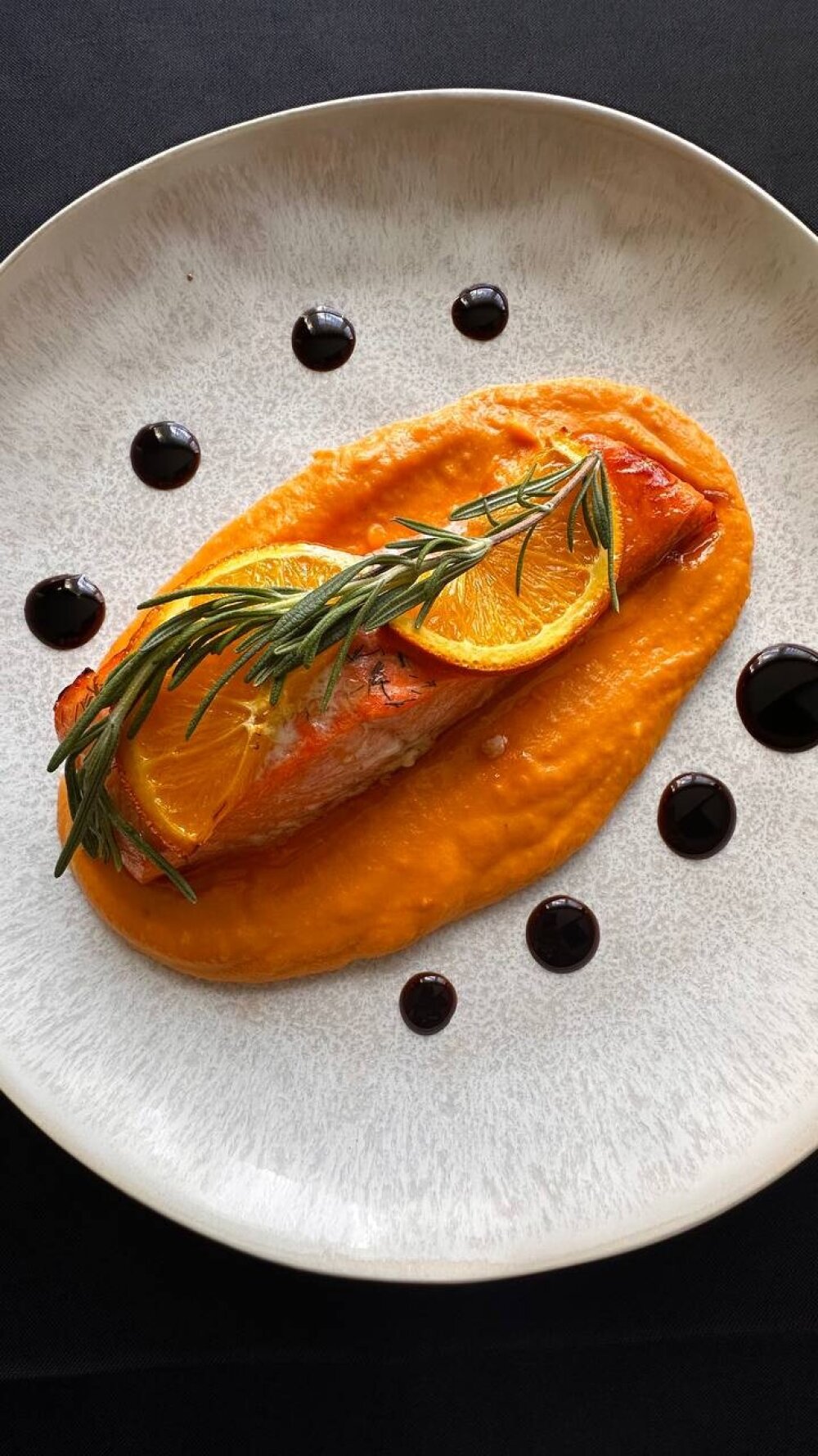 Стейк из семги с апельсиновой заправкой на подушке из батата