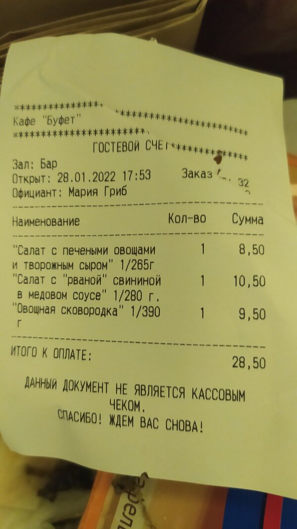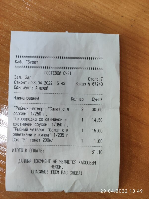 Добрый день! Посетили это кафе вчера. Нужно было оперативно покушать (в течение 45 минут), поэтому заказ сделали заранее на определенное время. К назначенному часу все было готово! Блюда, заказанные нами, приготовлены вкусно, (было видно, что они готовились к нашему приходу, а не разогреты приготовленные полуфабрикаты),и подача блюда нам тоже понравилась (современно и со вкусом), что добавило нам положительного эстетического удовольствия! Обслуживание вежливое и внимательное!!! Плюс бонусом было то, что в четверг у них рыбный день и на блюда с рыбой была ощутимая скидка! Было неожиданно и приятно!!! Спасибо всем работникам Буфета!