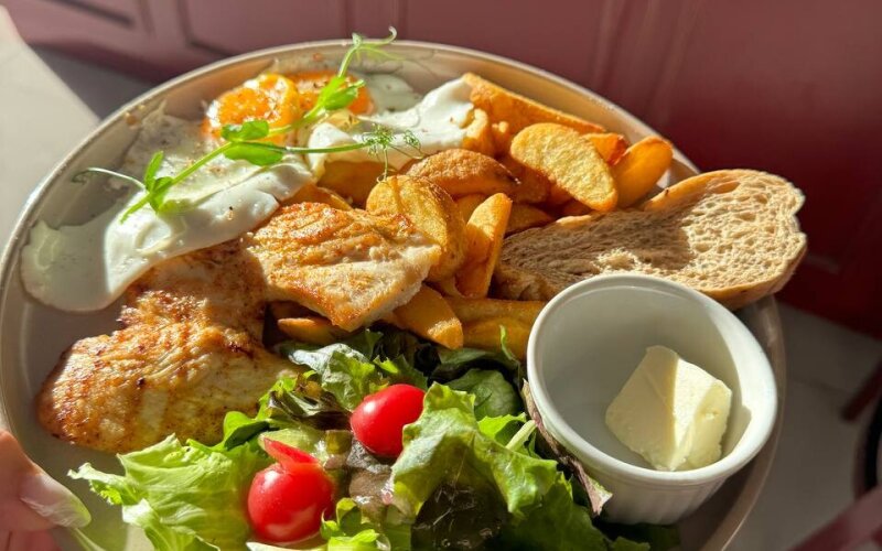 Яичница, куриное филе на гриле, картофельные дольки/картофель фри, микс салата, хлеб, масло сливочное