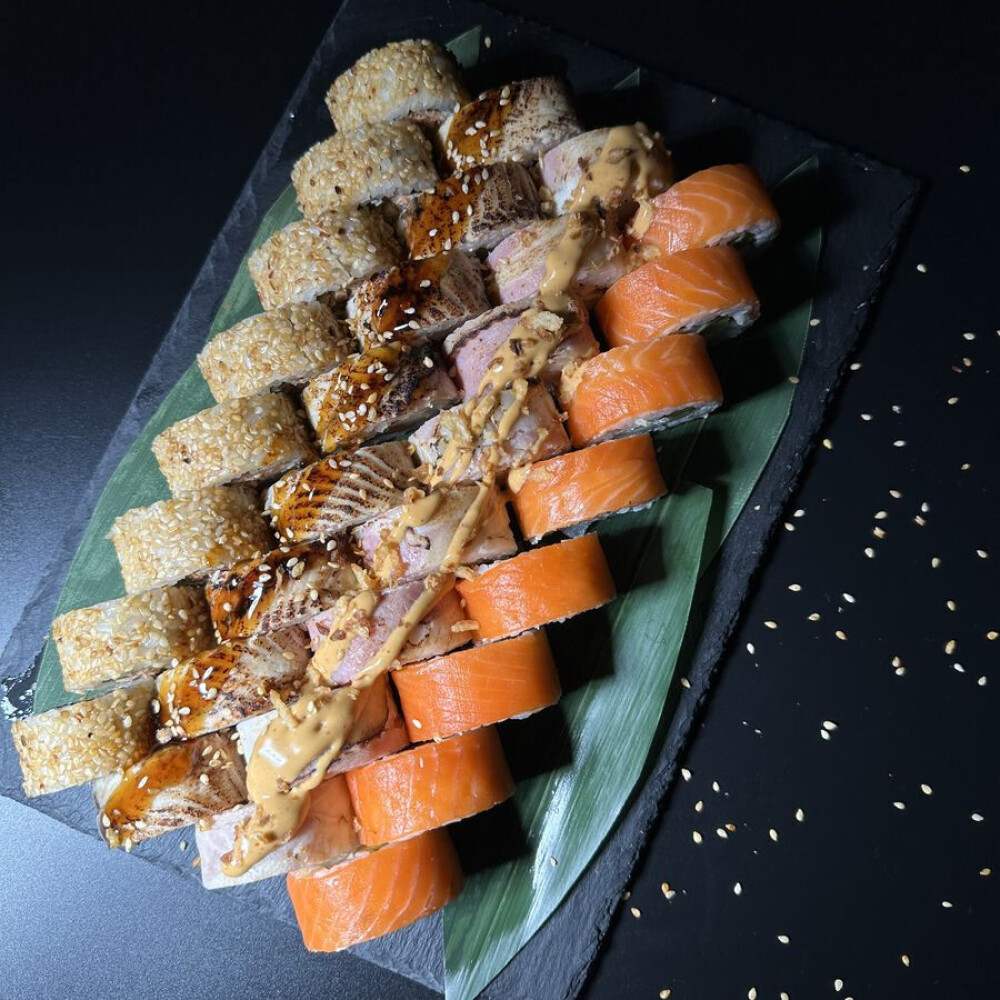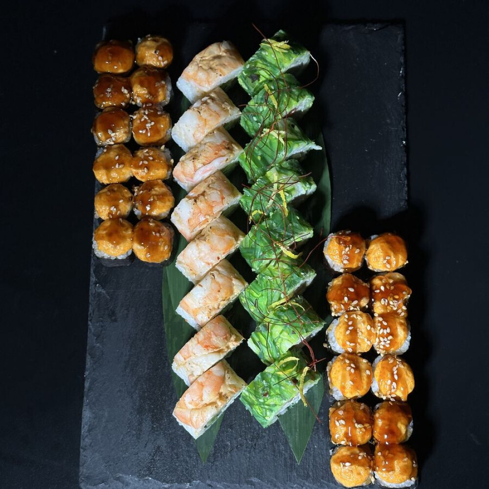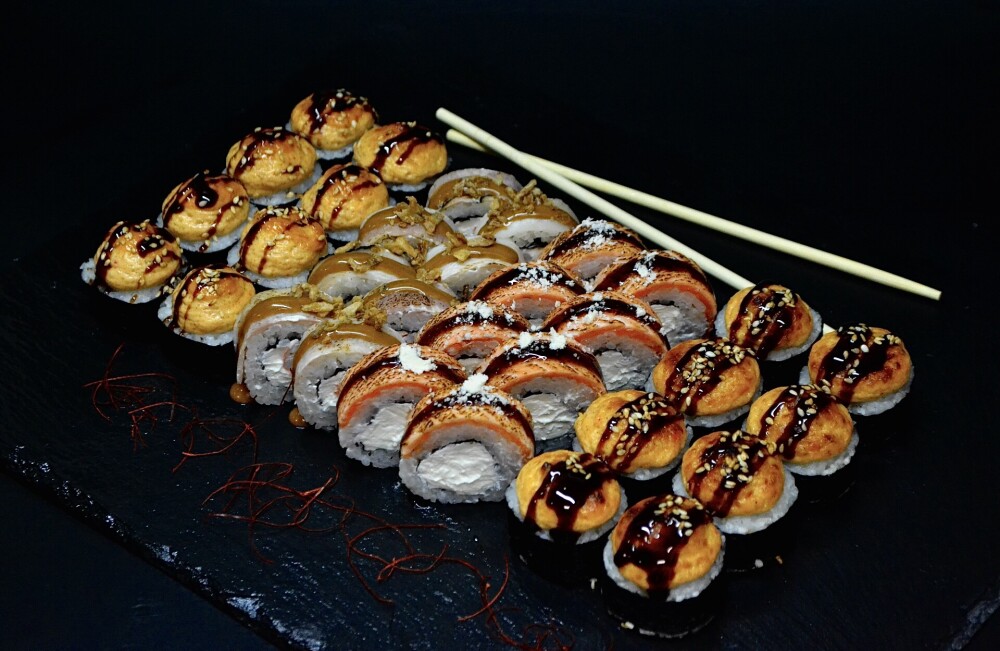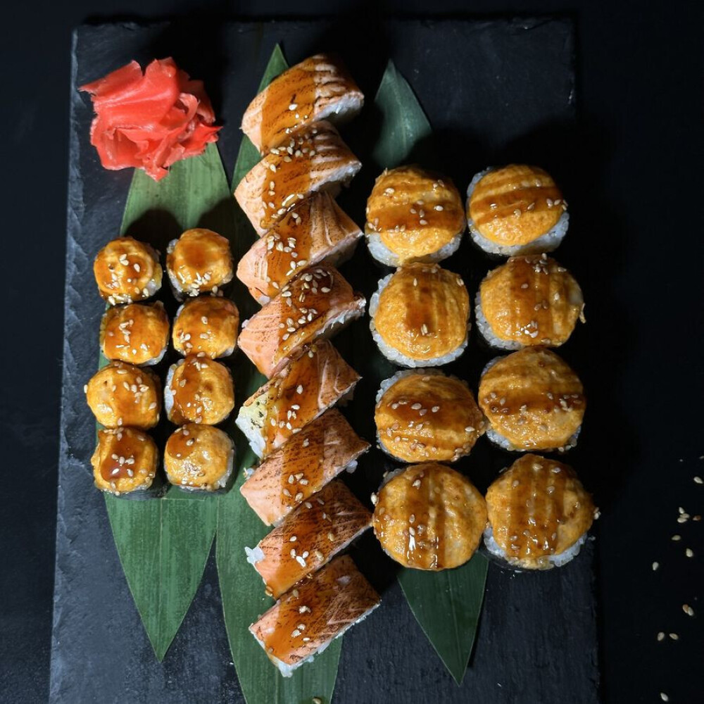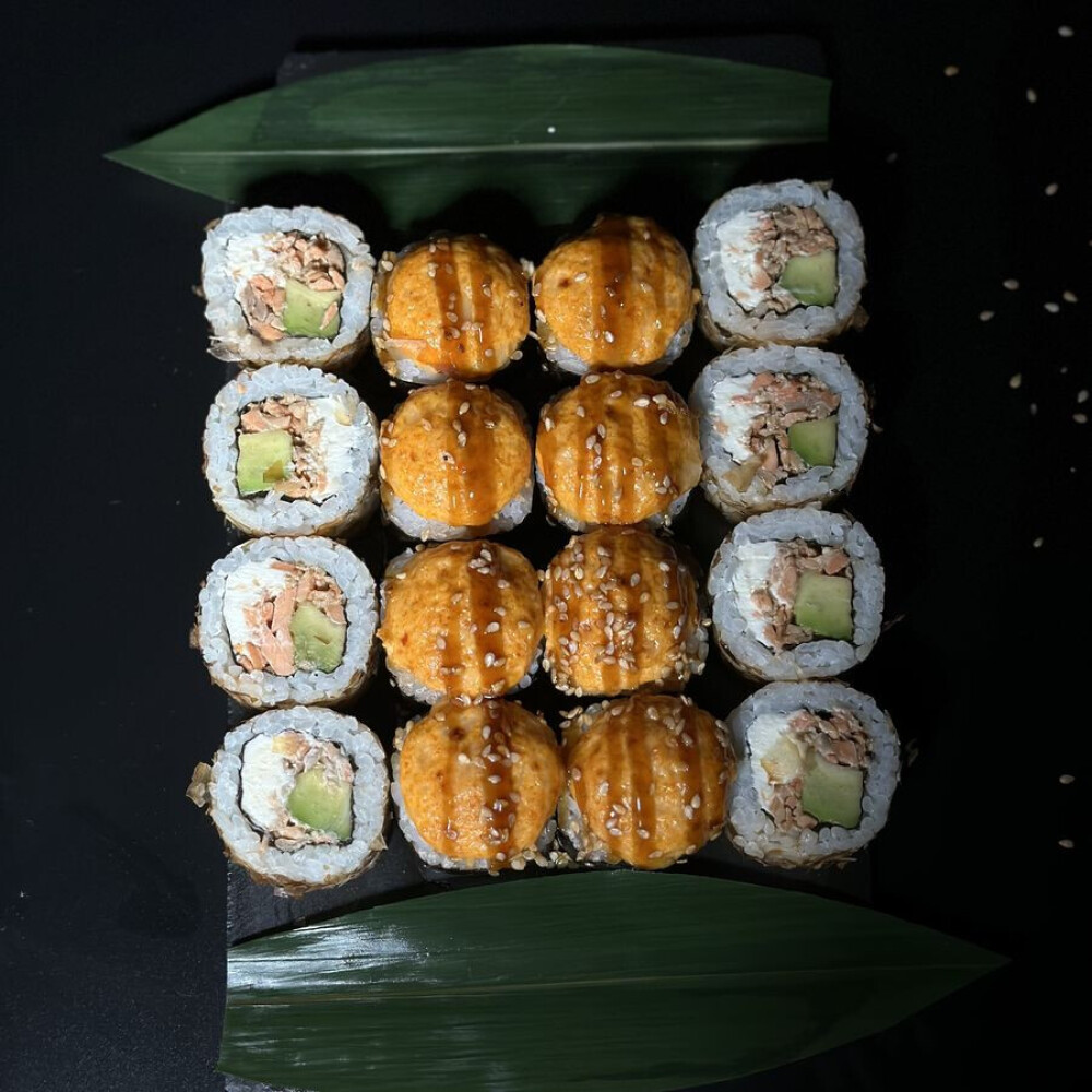 Запеченный ролл с лососем, запеченный ролл с тунцом и такуаном , запеченный «Хосо креветка», запеченный «Хосо огурец», «Филадельфия» с огурцом, «Бонито», ролл в угре и тунце, «Калифорния»
