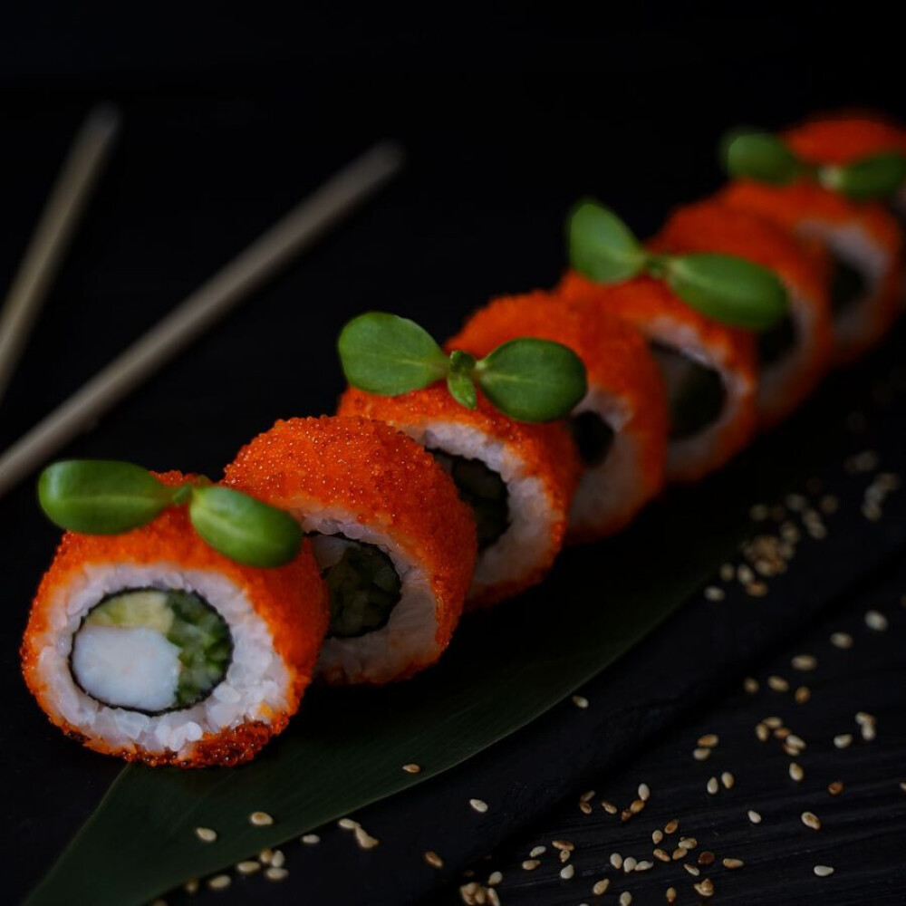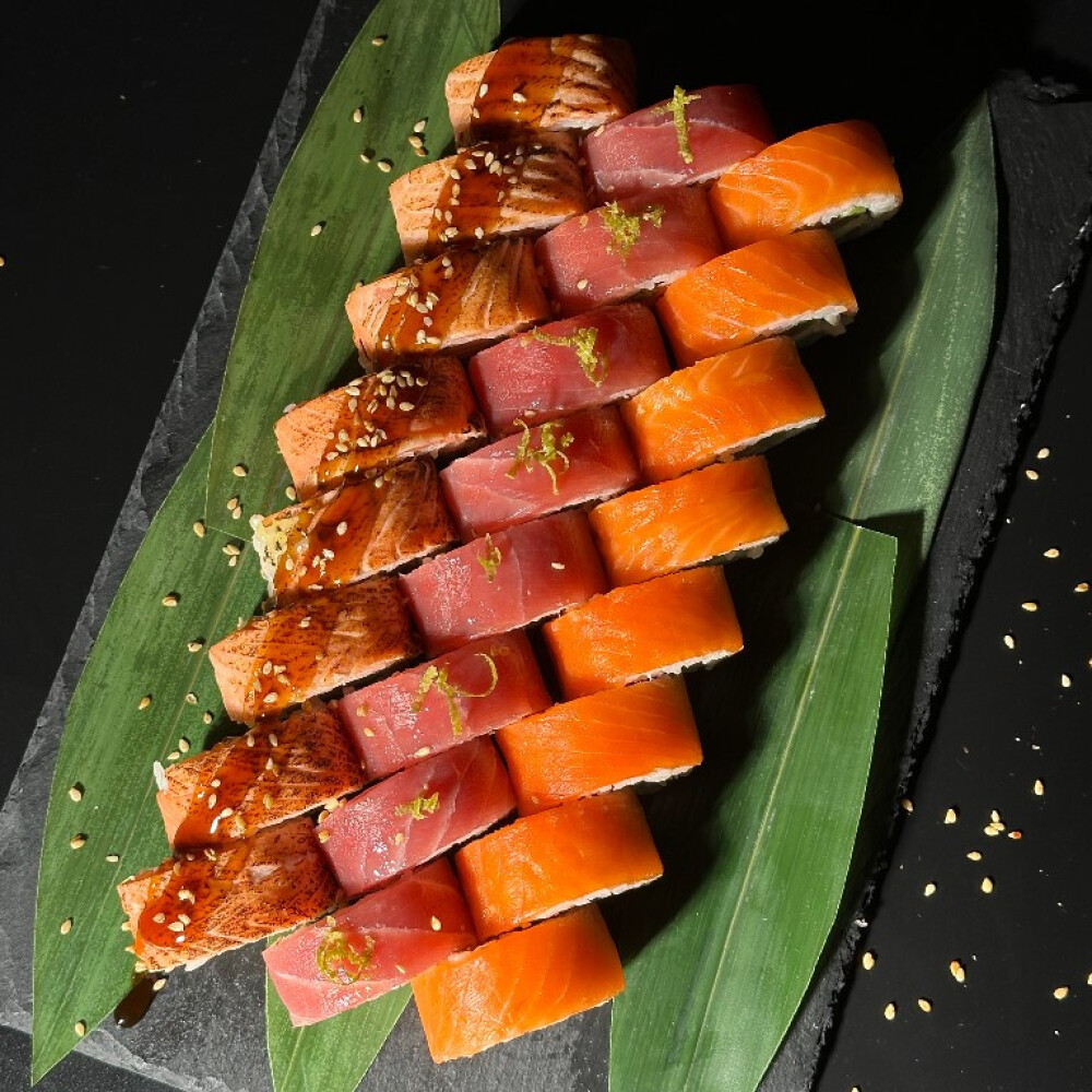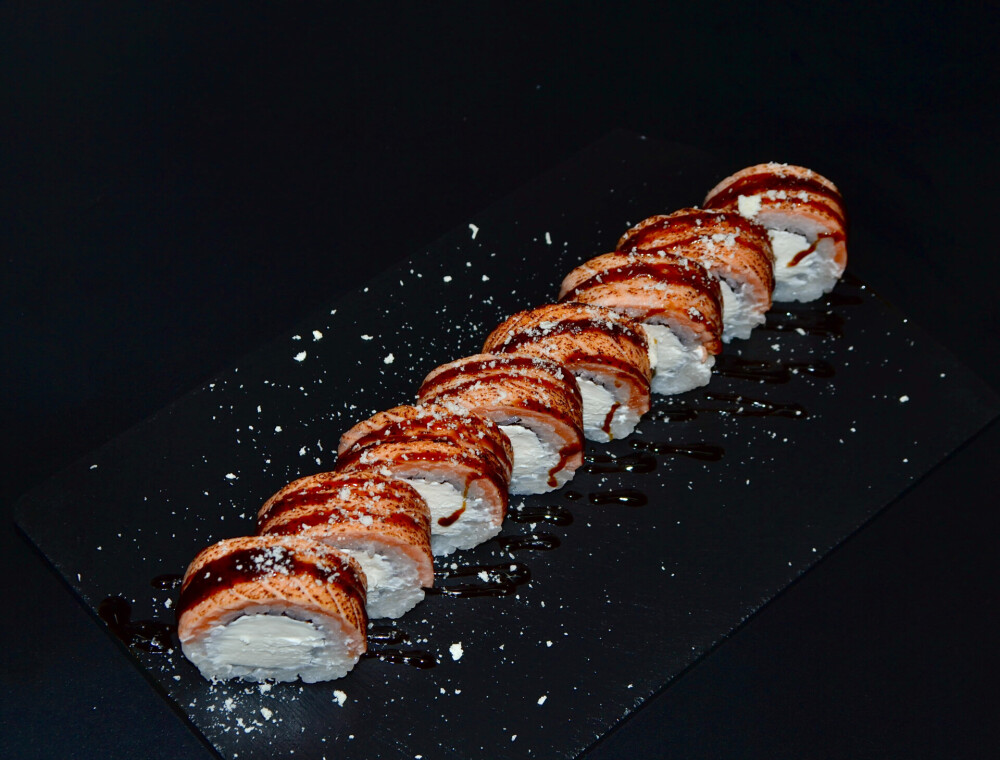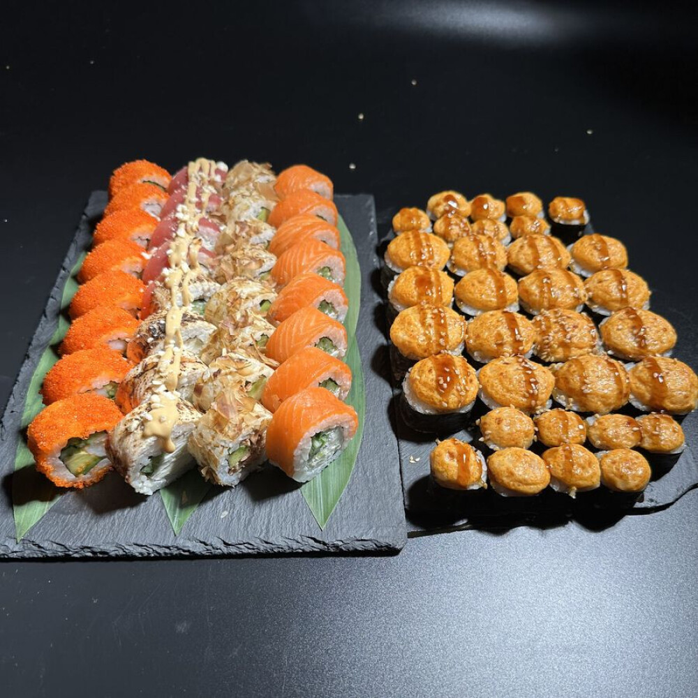 Запеченный ролл с лососем, запеченный ролл с тунцом и такуаном , запеченный «Хосо креветка», запеченный «Хосо огурец», «Филадельфия» с огурцом, «Бонито», ролл в угре и тунце, «Калифорния»