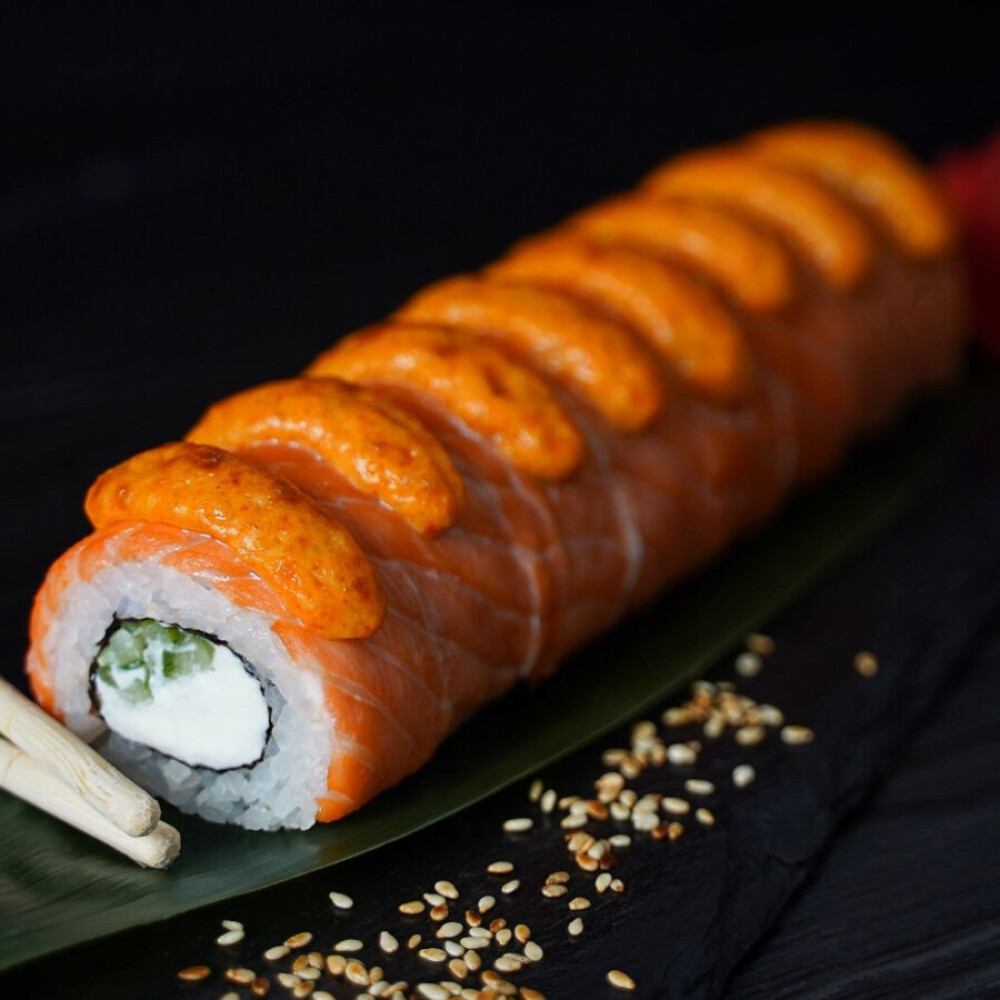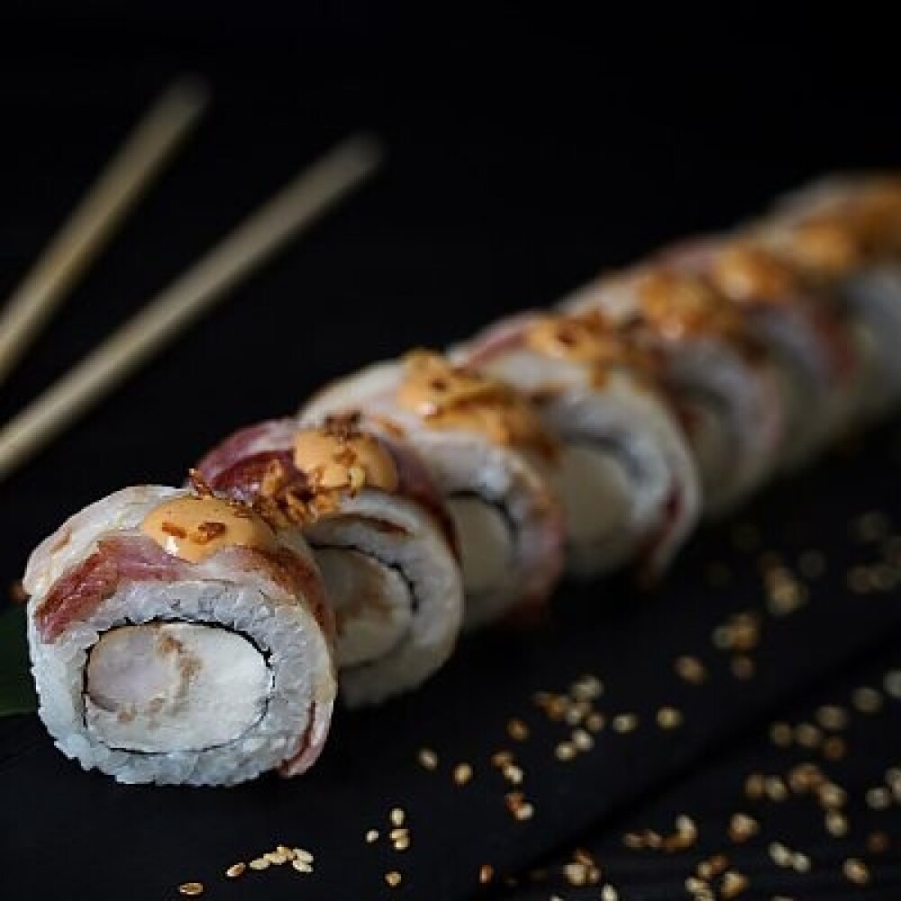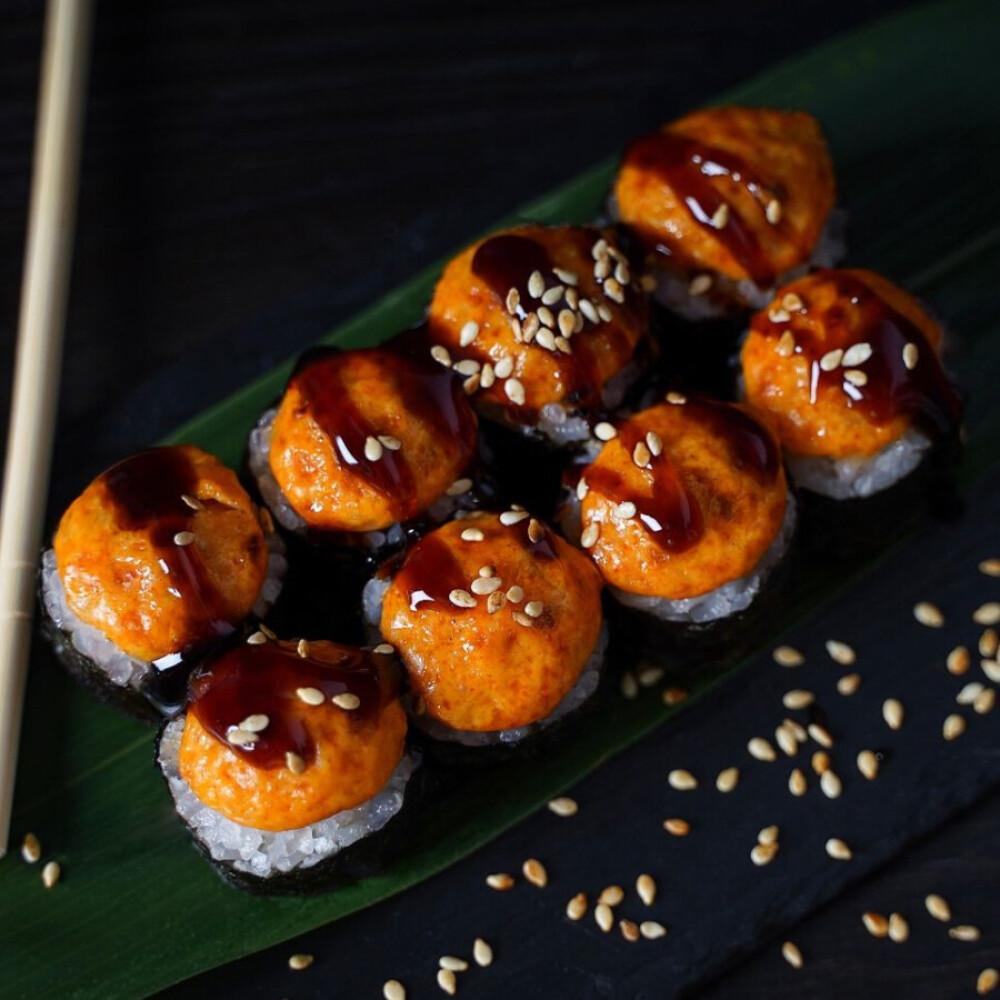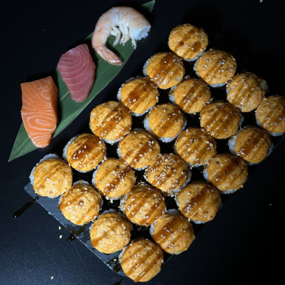 Запеченный ролл с лососем, запеченный ролл с тунцом, запеченный ролл с креветкой