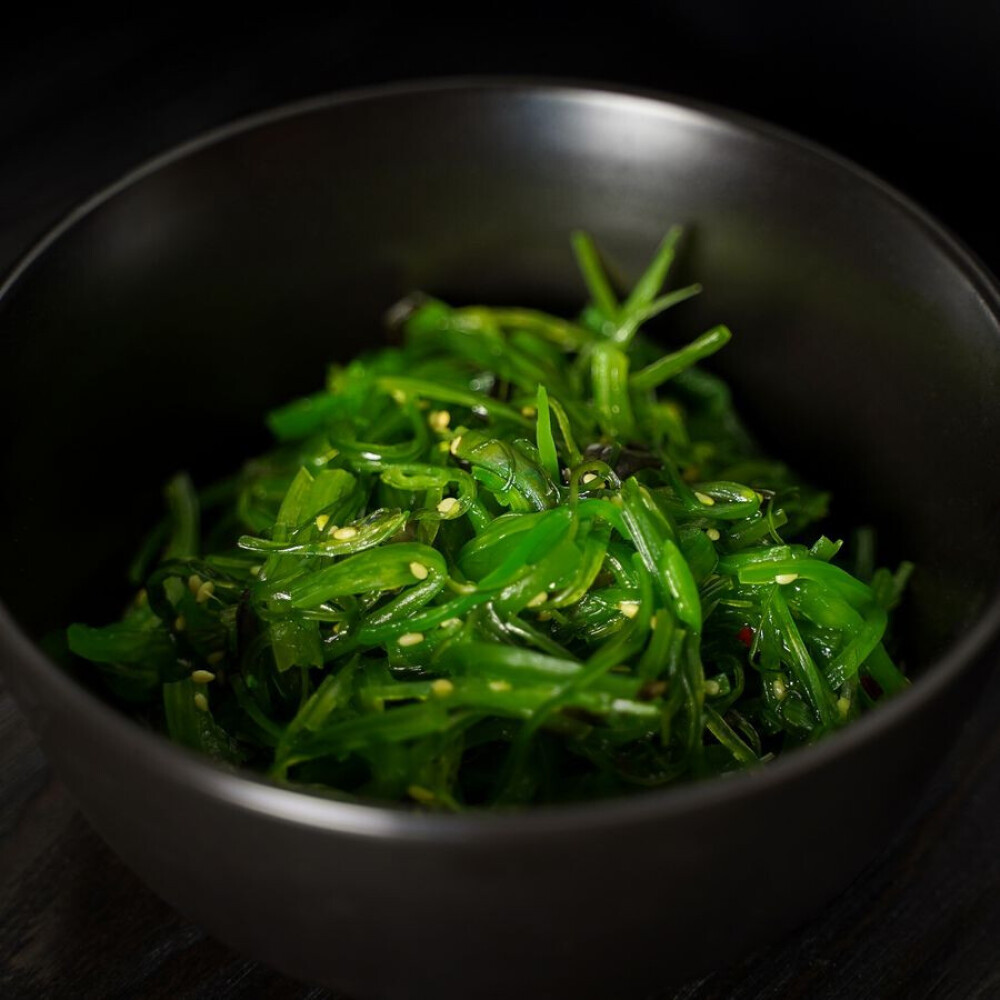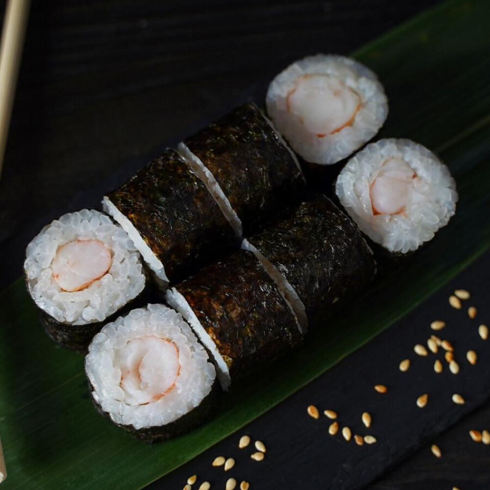Запеченный «Хосо лосось», запеченный «Хосо креветка», запеченный «хосо огурец», ролл в чука салате, ролл в креветке