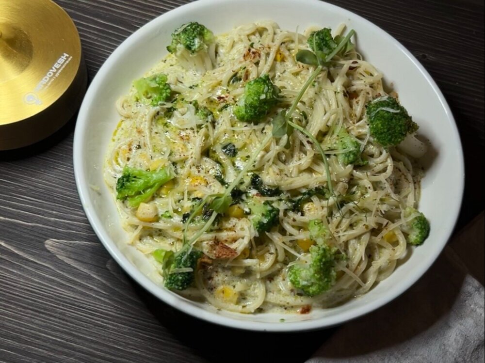 Спагетти, песто, брокколи, помидор, кукуруза