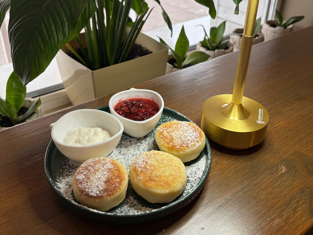 Сырники из рикотты, сметана, джем