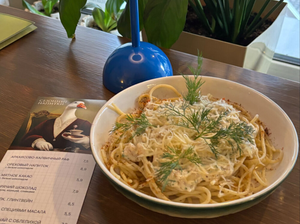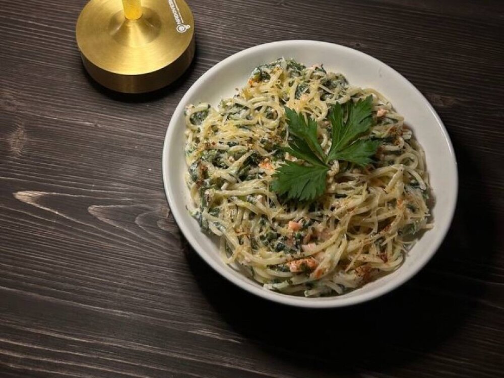 Спагетти, лосось, шпинат, сыр «Пармезан», сливочный соус