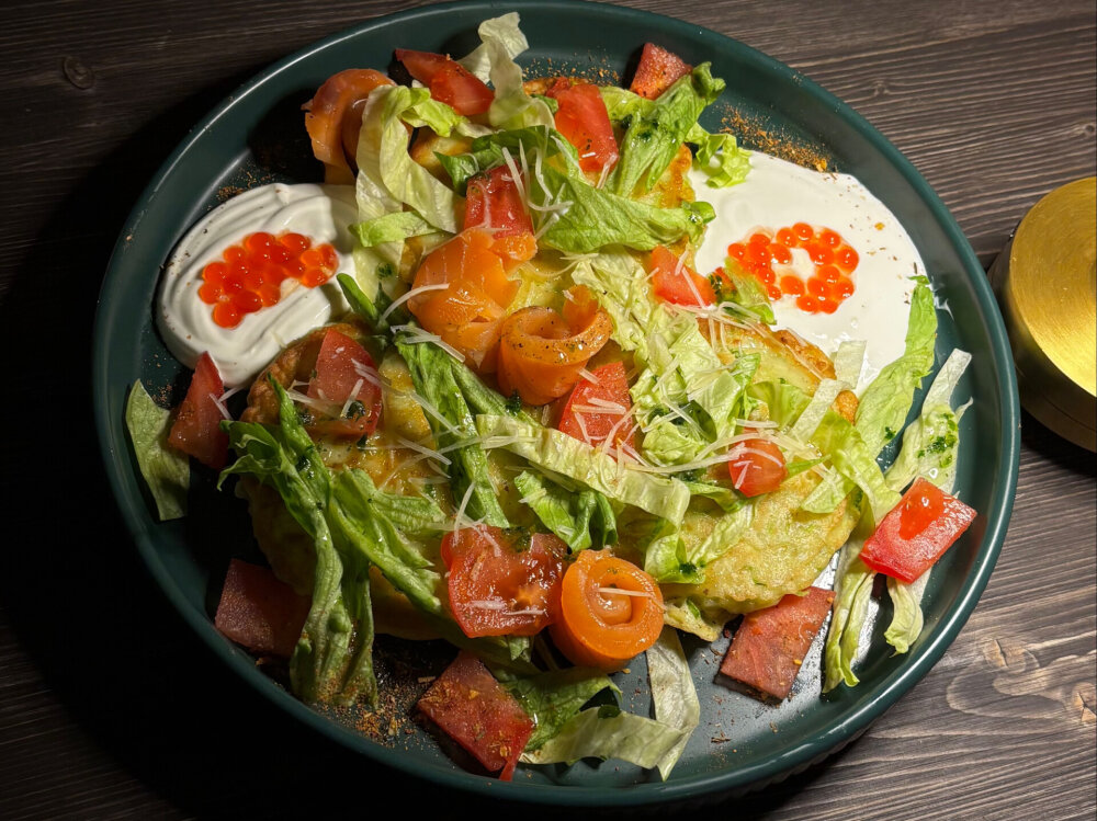 Кабачковые оладьи с красной рыбой