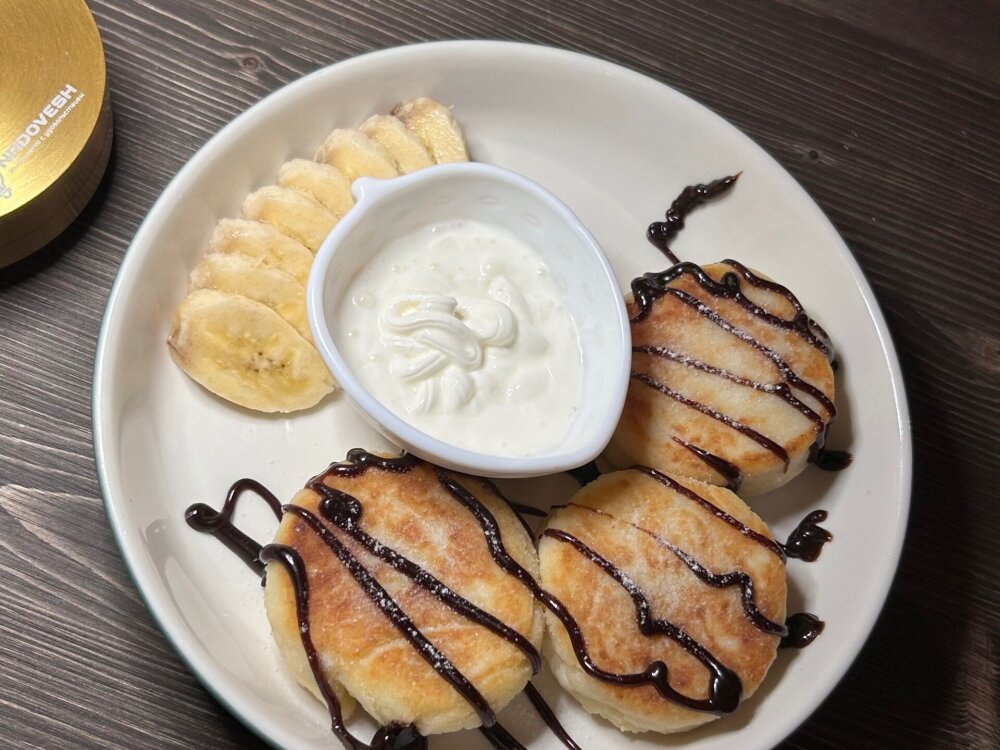 Сырники с бананом, сметаной и шоколадом