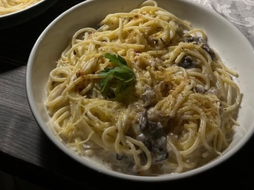 Спагетти, шампиньоны, сыр «Пармезан», сливочный соус