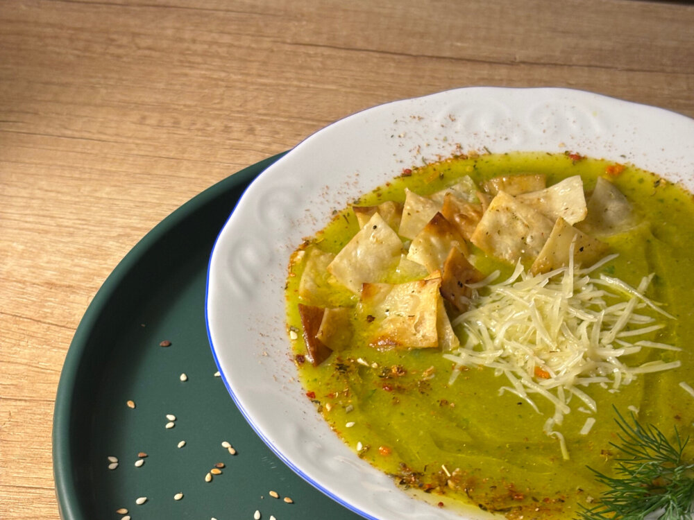 Чечевица, сухарики, сыр «Пармезан», зеленое масло