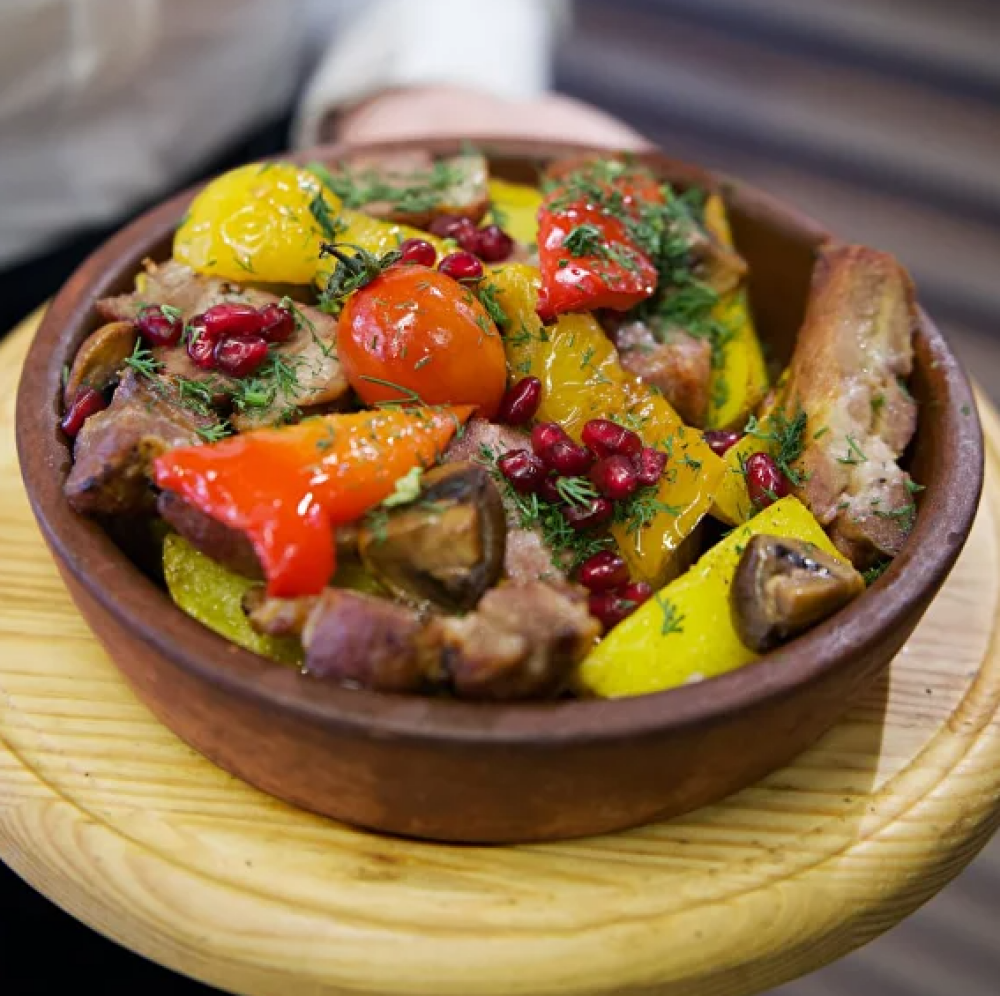 Свинина, картофель, лук, сладкий перец, шампиньоны, помидоры «Черри», зелень, гранат