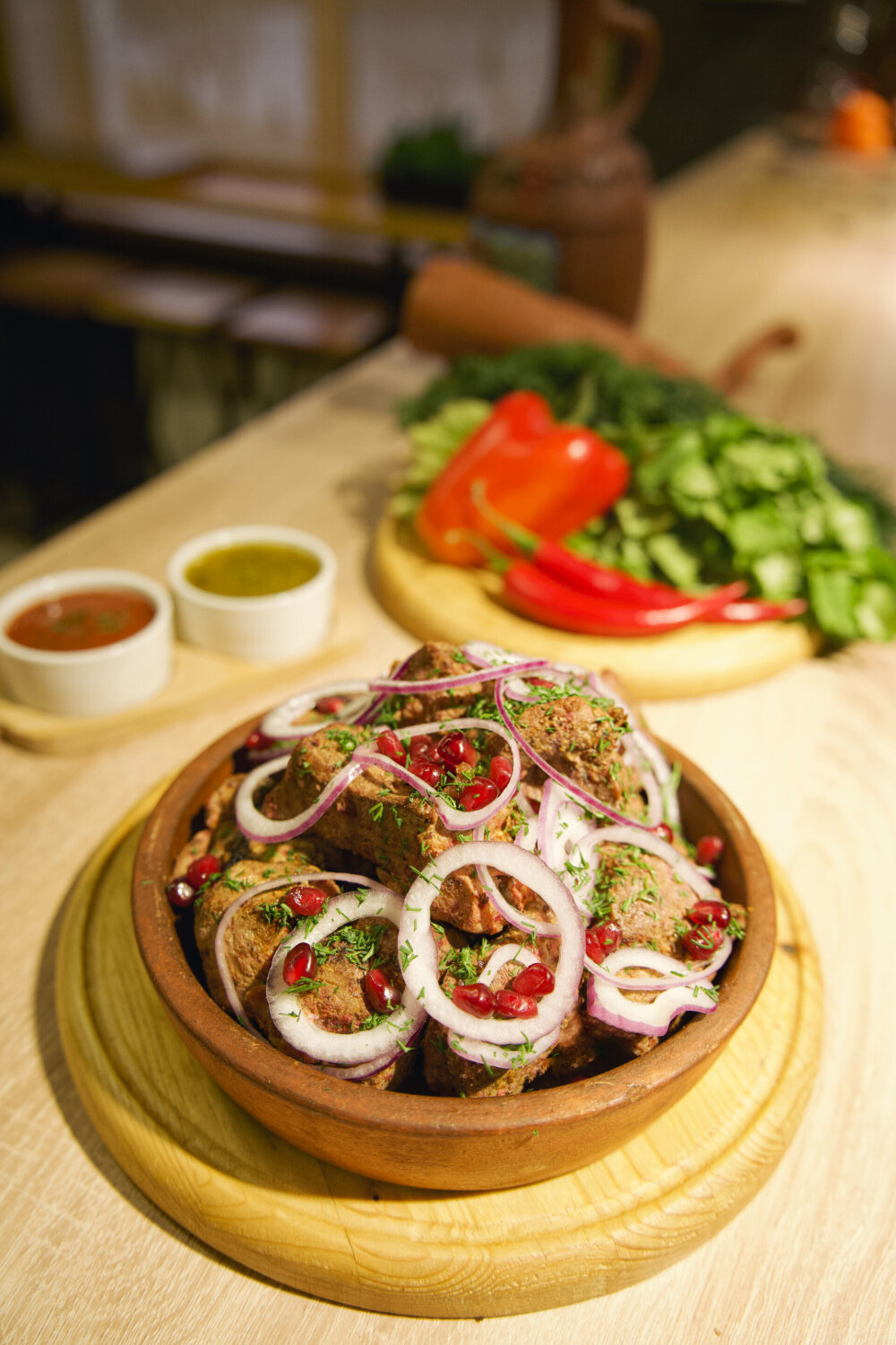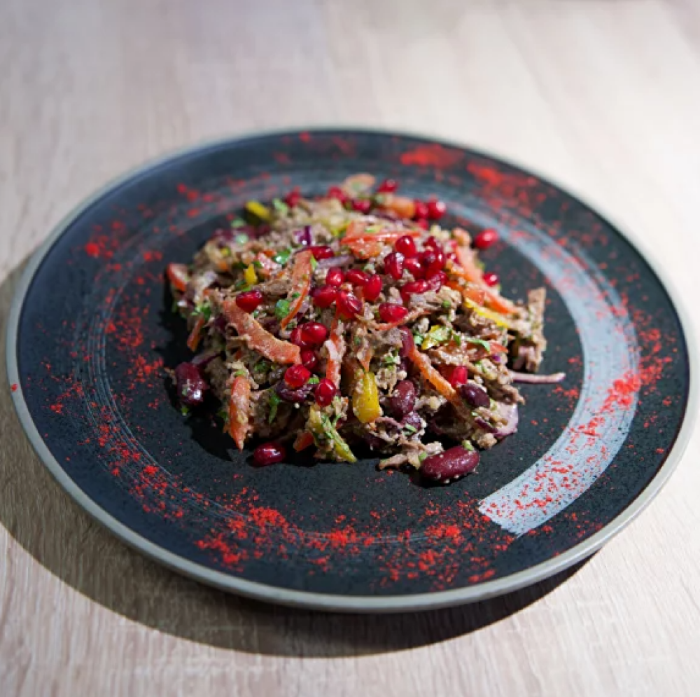 Отварная говядина, красная фасоль, синий лук, сладкий перец, чеснок, кинза, грецкий орех, оливковое масло, специи, гранат