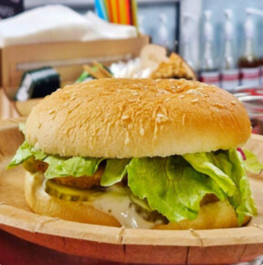 Котлета куриная, огурец соленый, лук красный маринованный, салат, сыр «Сулугуни»