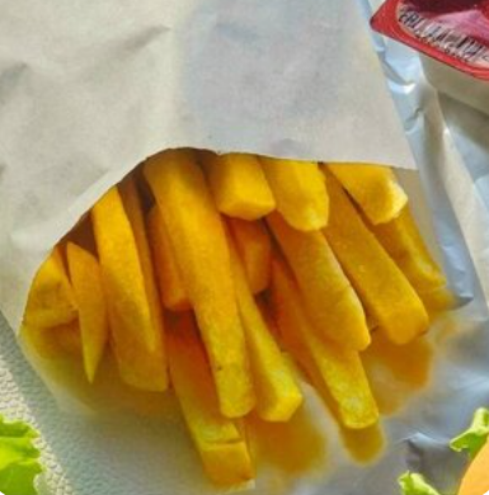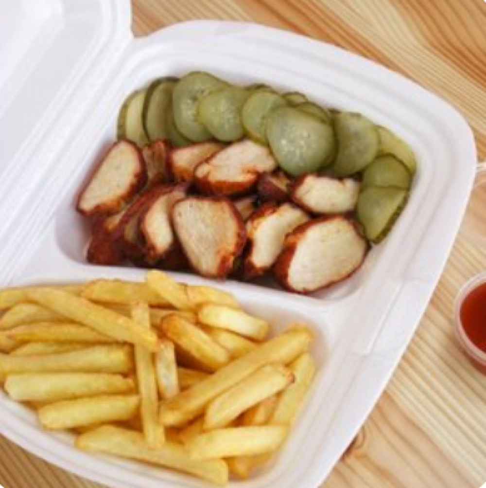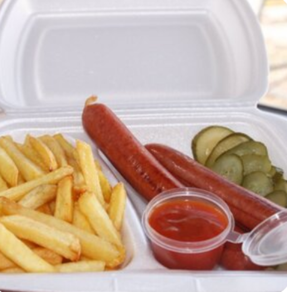 Колбаски говяжьи, огурцы соленые, картофель фри
