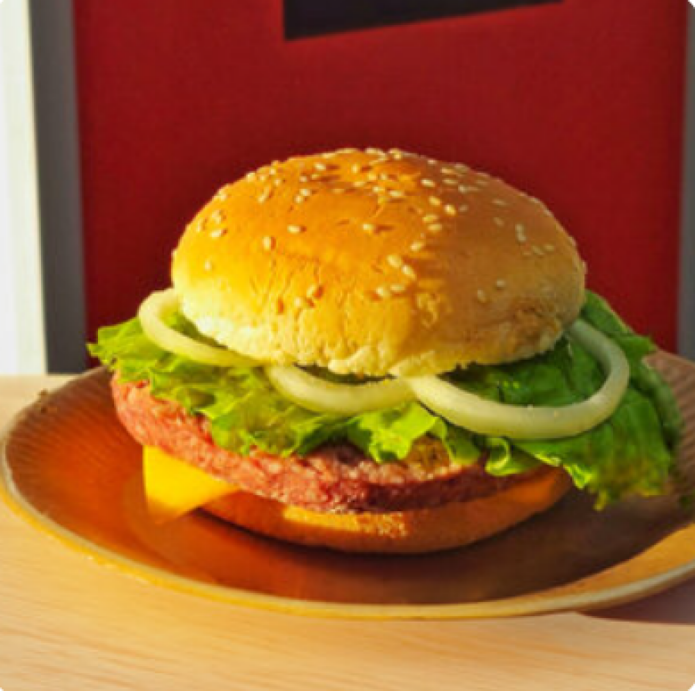 Булочка с кунжутом, говяжья котлета, сыр «Чеддер», маринованные огурцы, лук, салат