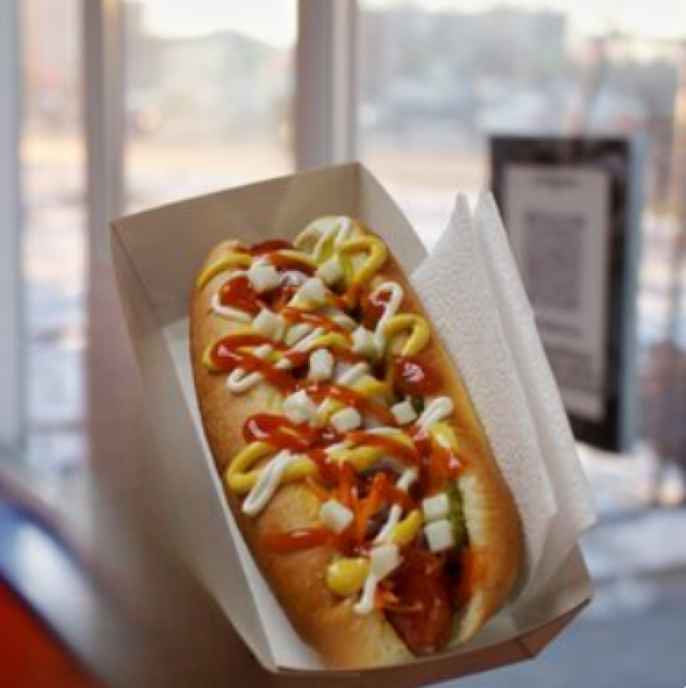 Говяжья колбаска, морковь «По-корейски», огурец соленый, салат, сыр «Моцарелла», кетчуп, майонез, горчица