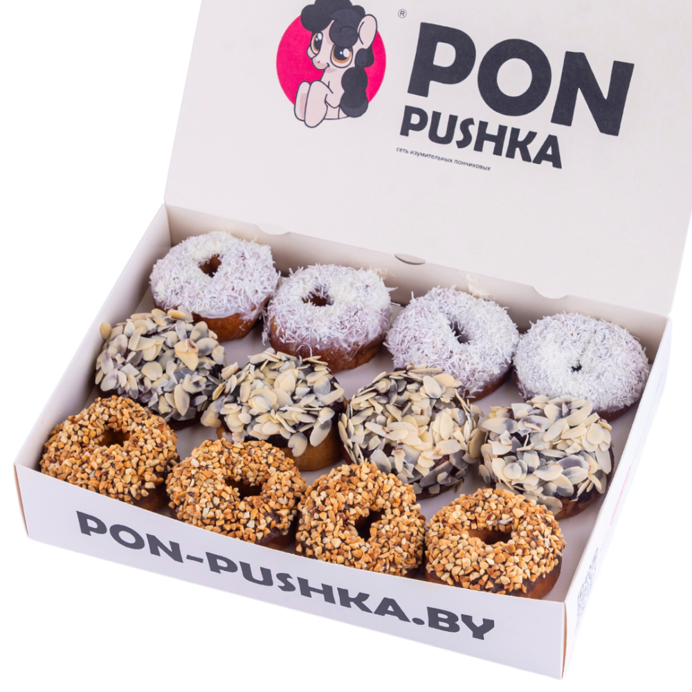 4 пончика с кокосом, 4 с миндалем и 4 с арахисом