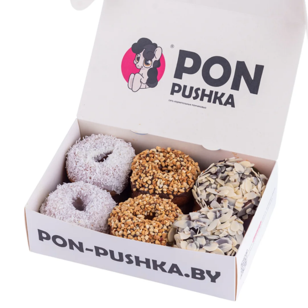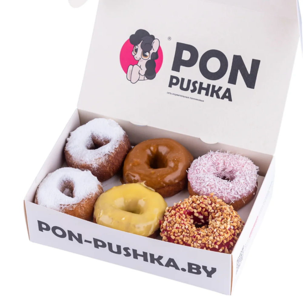 2 напудренных, 2 классических, 2 глазированных, 2 глазированных с посыпкой, 2 начиненных, 2 пончика Pro