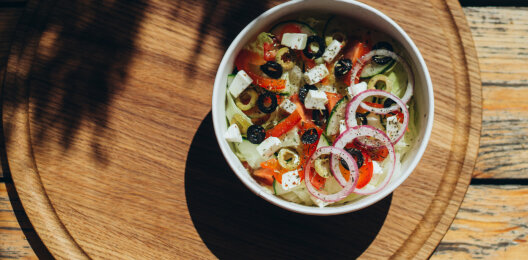 Основными ингредиентами классического греческого салата принято считать помидоры, огурцы, зелёный болгарский перец, красный лук, оливки и сыр «Фета». Фишка этого блюда заключается в том, что продукты не стараются нарезать так же мелко, как для других салатов — их нарочито крошат большими кубиками. Поэтому его приготовление не займет у вас много времени. Для салата вам понадобится: