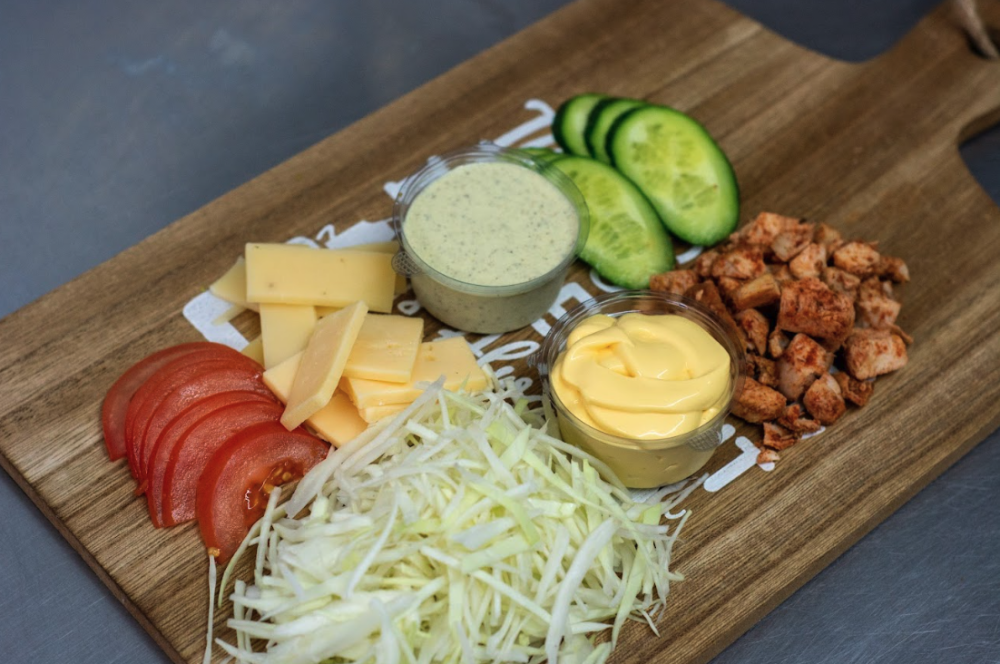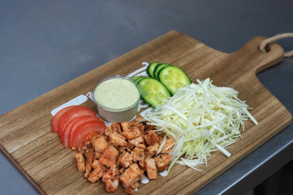 Капуста, огурец, помидор, курица, соус «Фирменный», острые специи