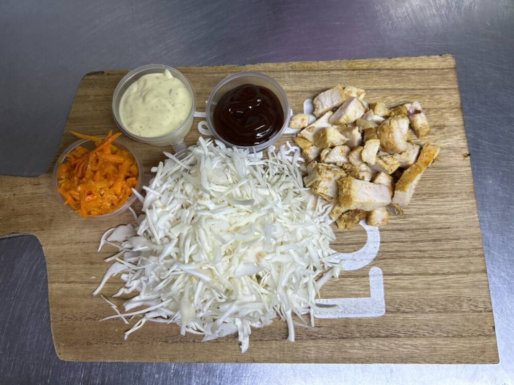 Капуста, морковь пряная, курица, соус «Барбекю», соус «Фирменный», специи