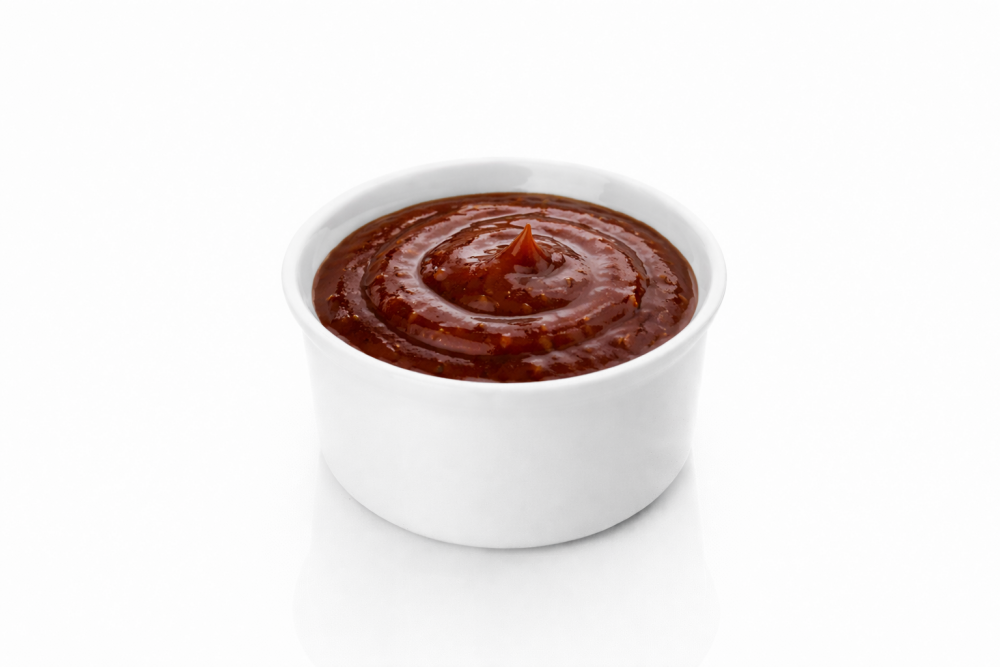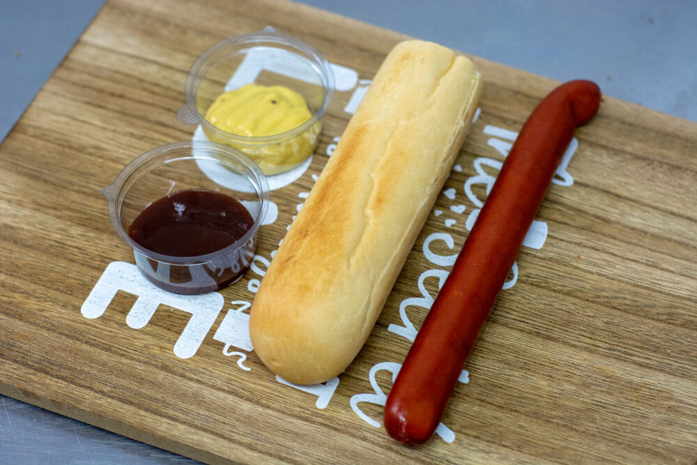 Булка, сосиска копчёная, соус «Барбекю», горчица