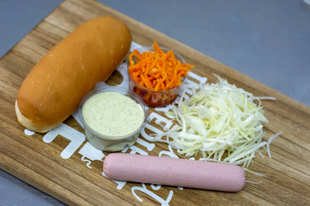 Булка, капуста, морковь пряная, сосиска, кетчуп, горчица