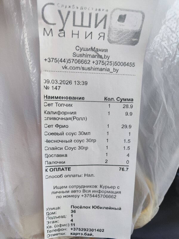 Палочки не положили , курьер подъехал не туда , терминал не работает( заранее об этом не предупредили ) пришлось скидывать с карты на карту (+комисия )курьер был не вежлив