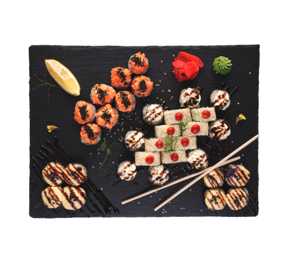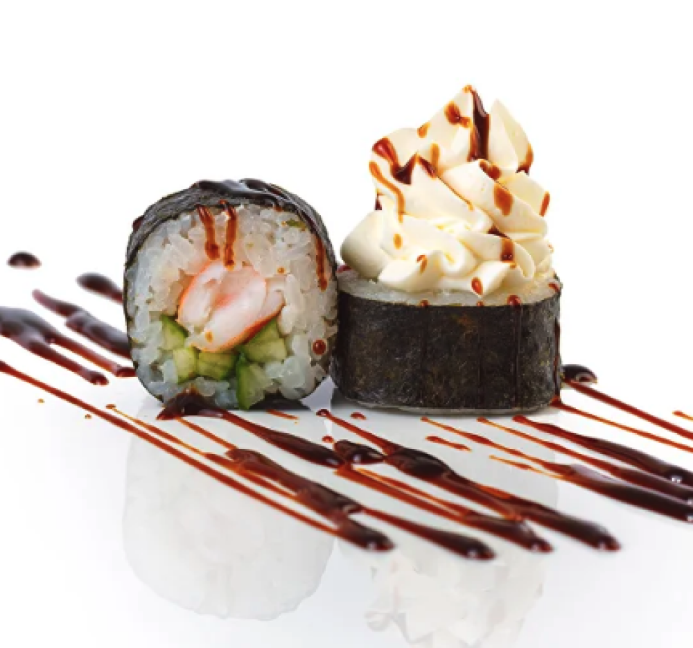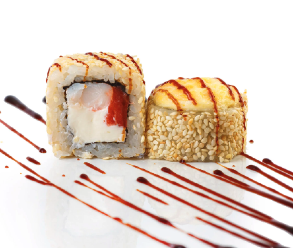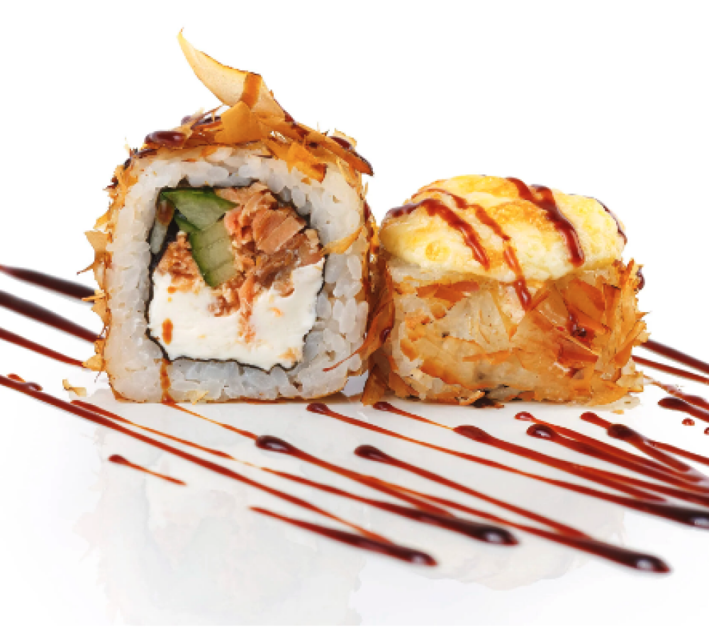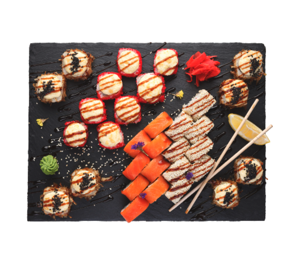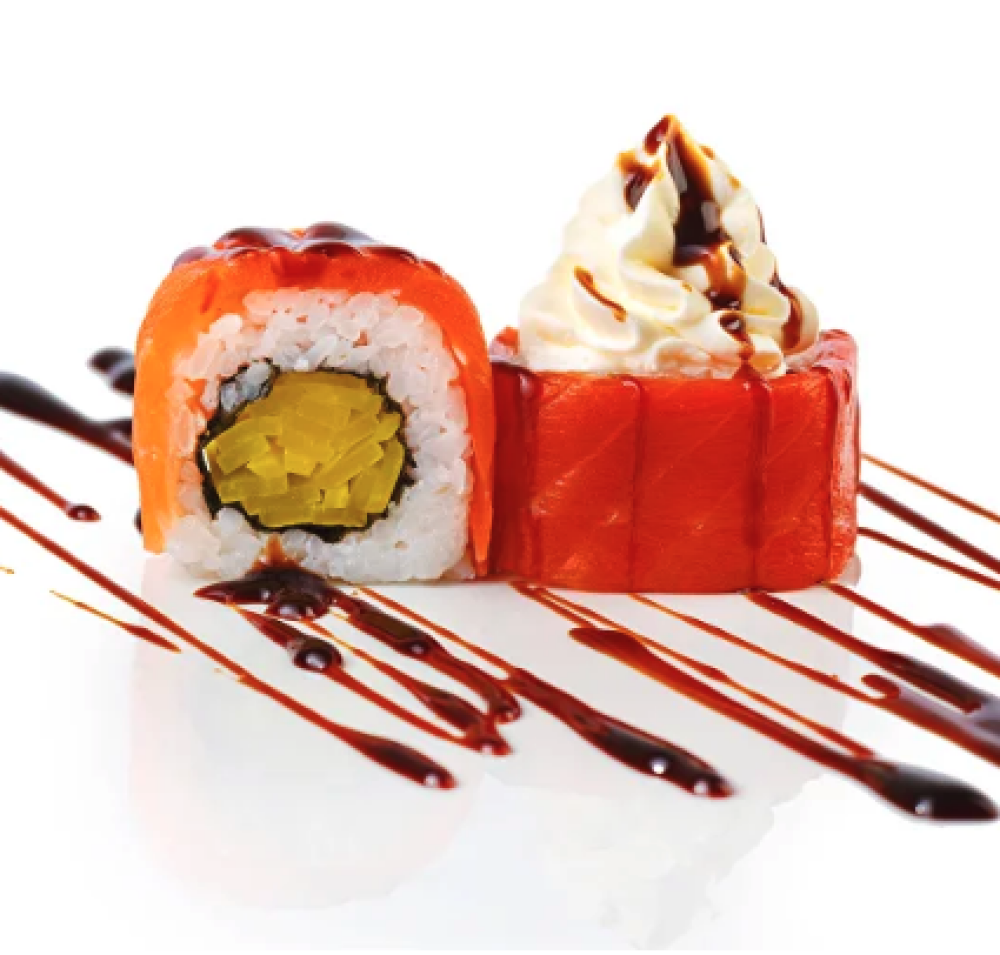 Ролл Темпура с лососем, Ролл с Тунцом и ананасом, Ролл Калифорния, Ролл Цундоку с беконом и соусом барбекю