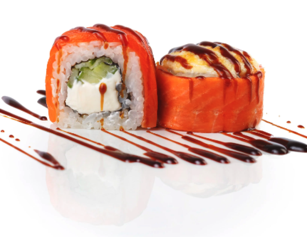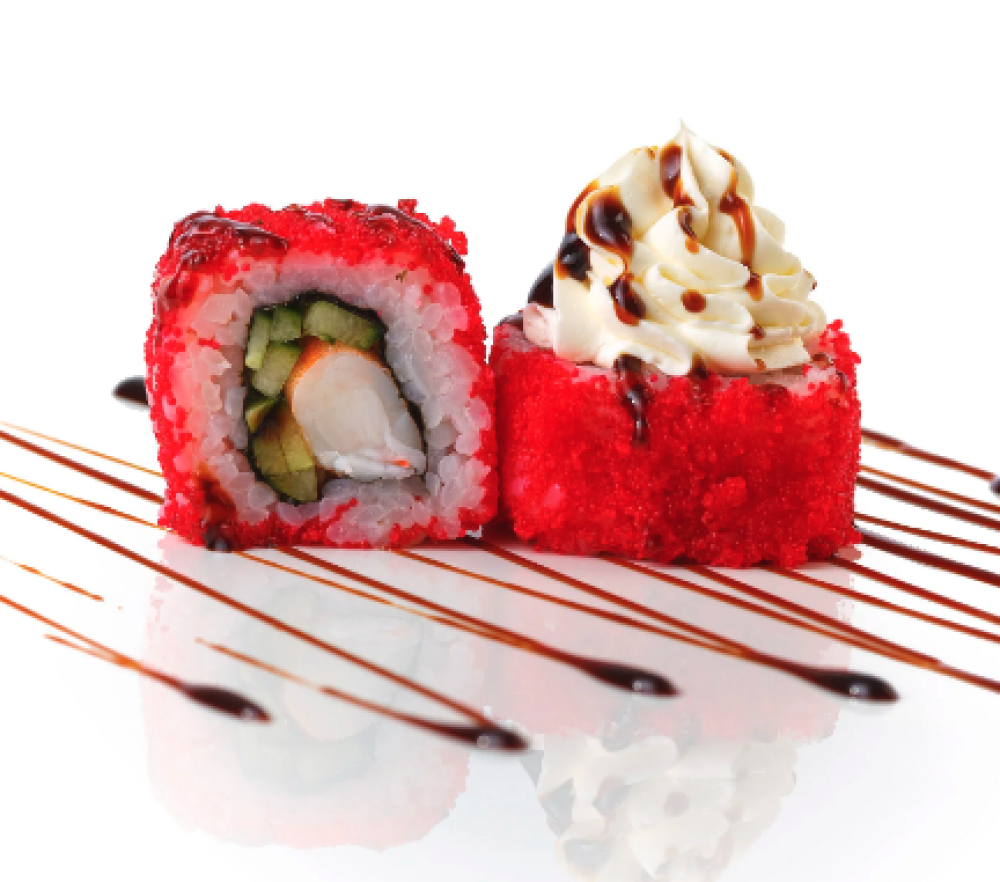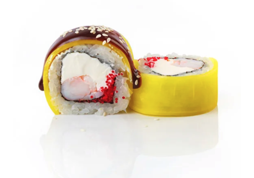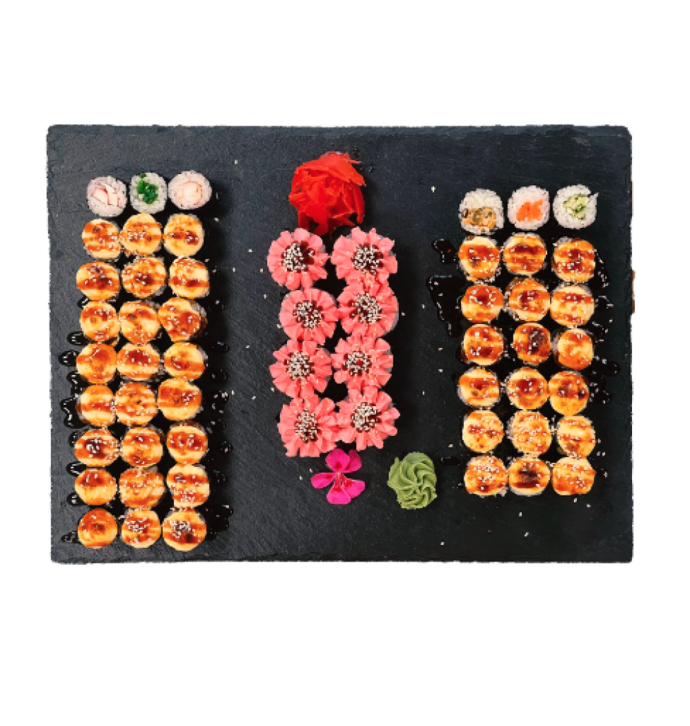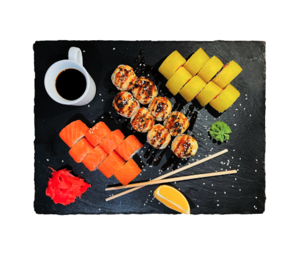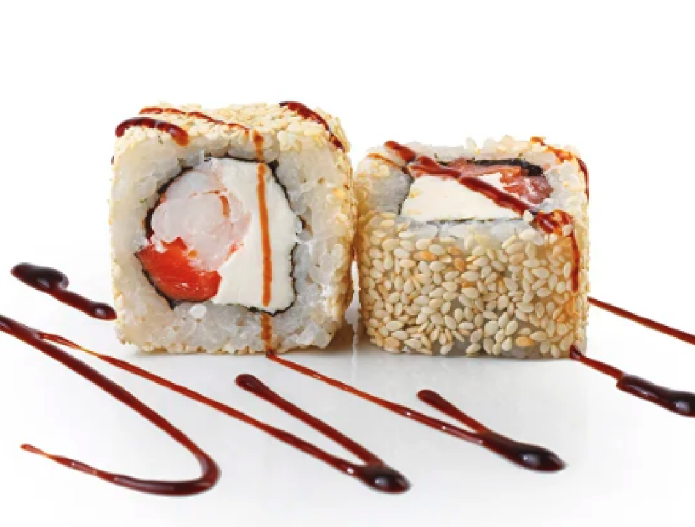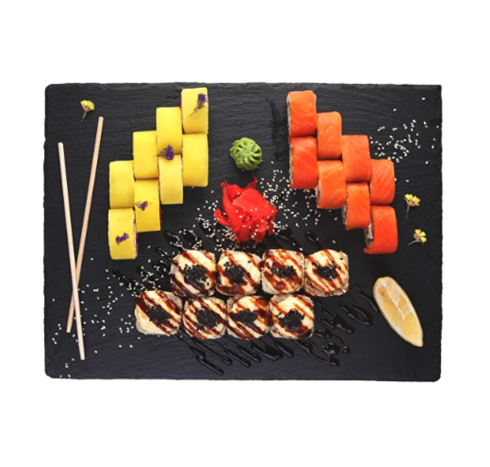 Ролл Темпура с лососем, Ролл с Тунцом и ананасом, Ролл Калифорния, Ролл Цундоку с беконом и соусом барбекю