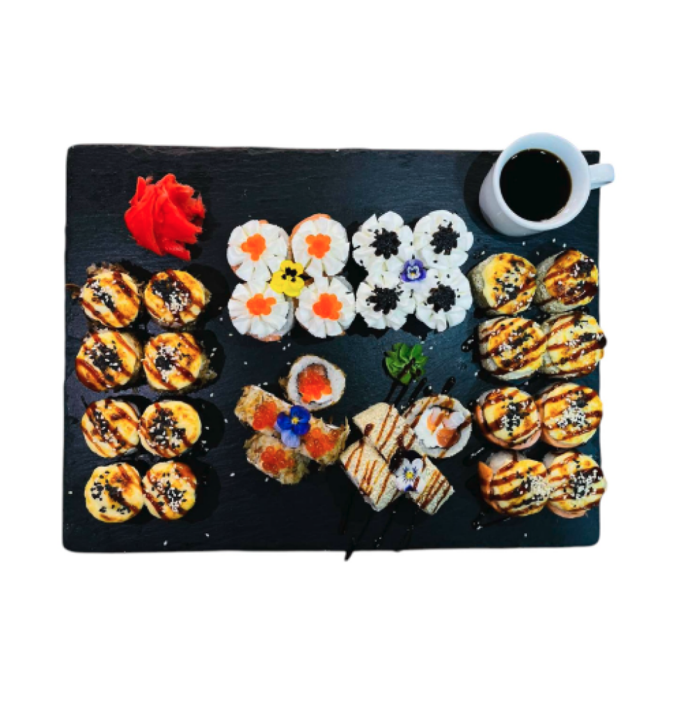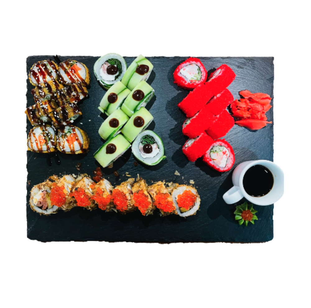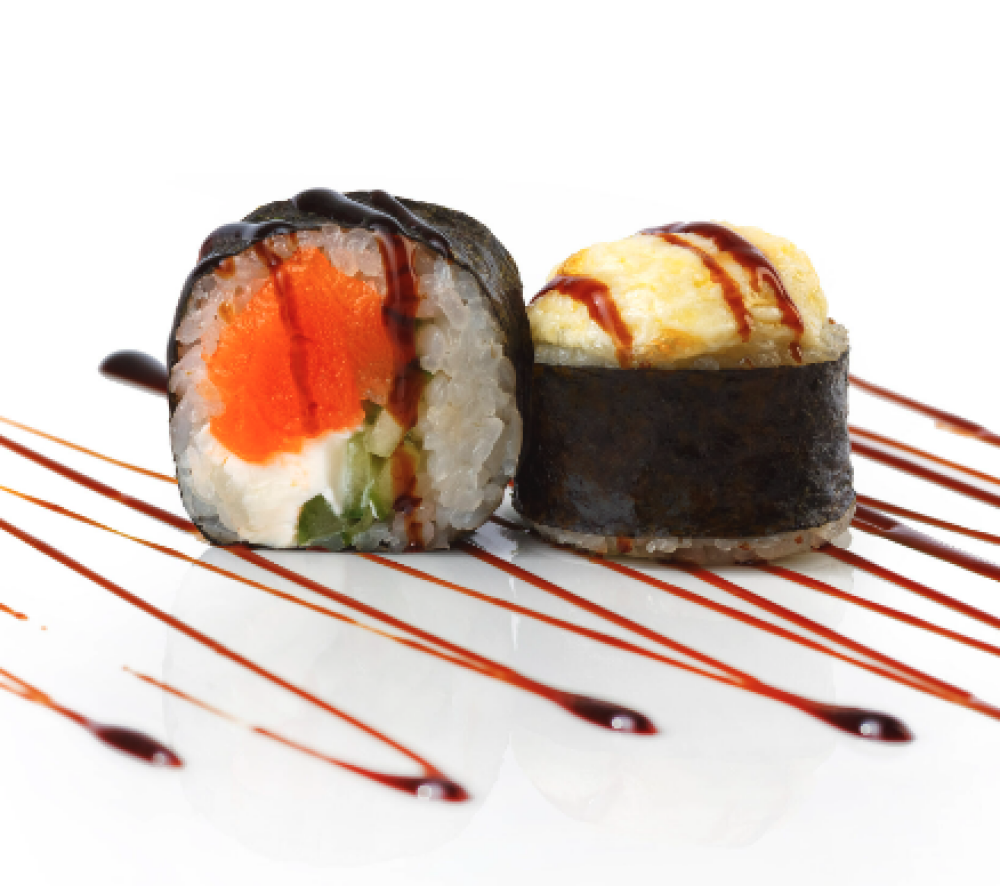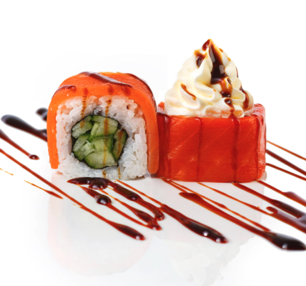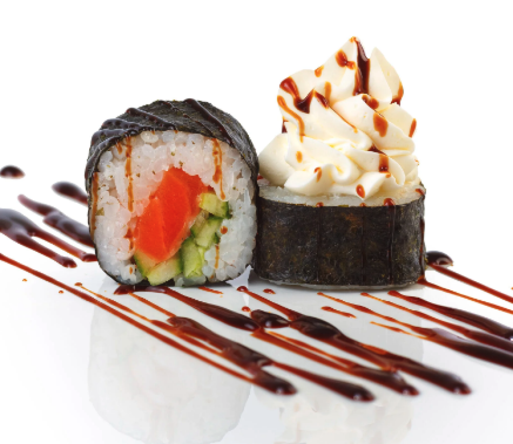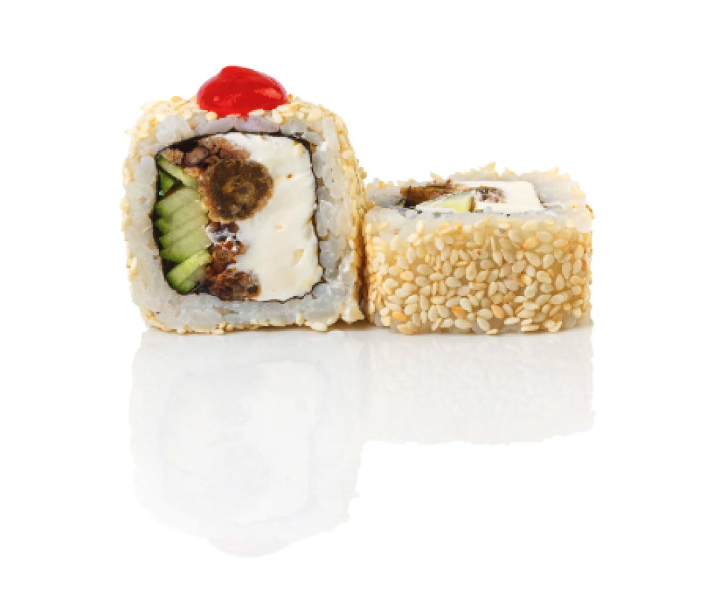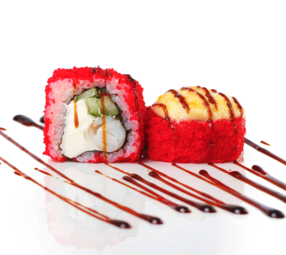 Ролл Темпура с лососем, Ролл с Тунцом и ананасом, Ролл Калифорния, Ролл Цундоку с беконом и соусом барбекю
