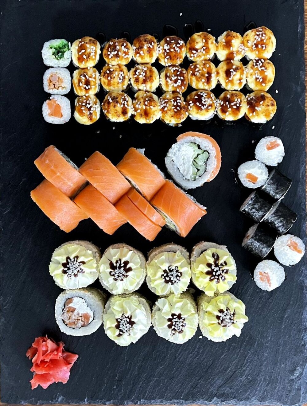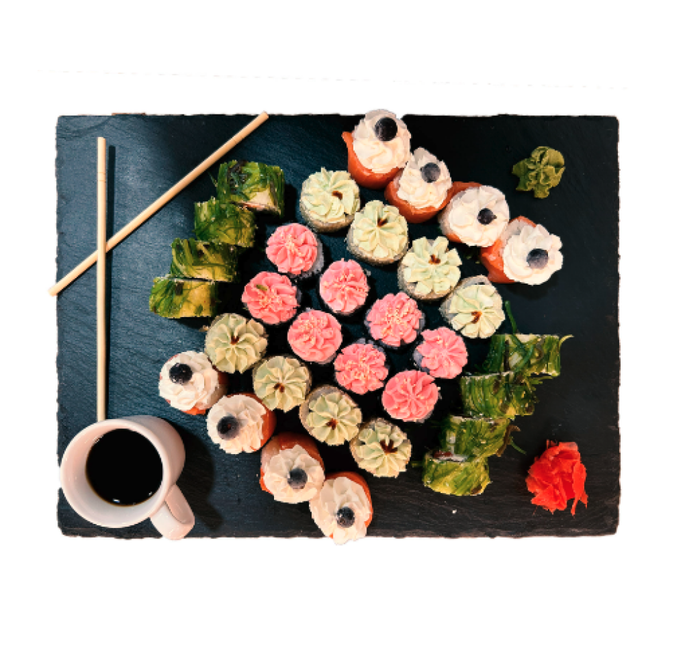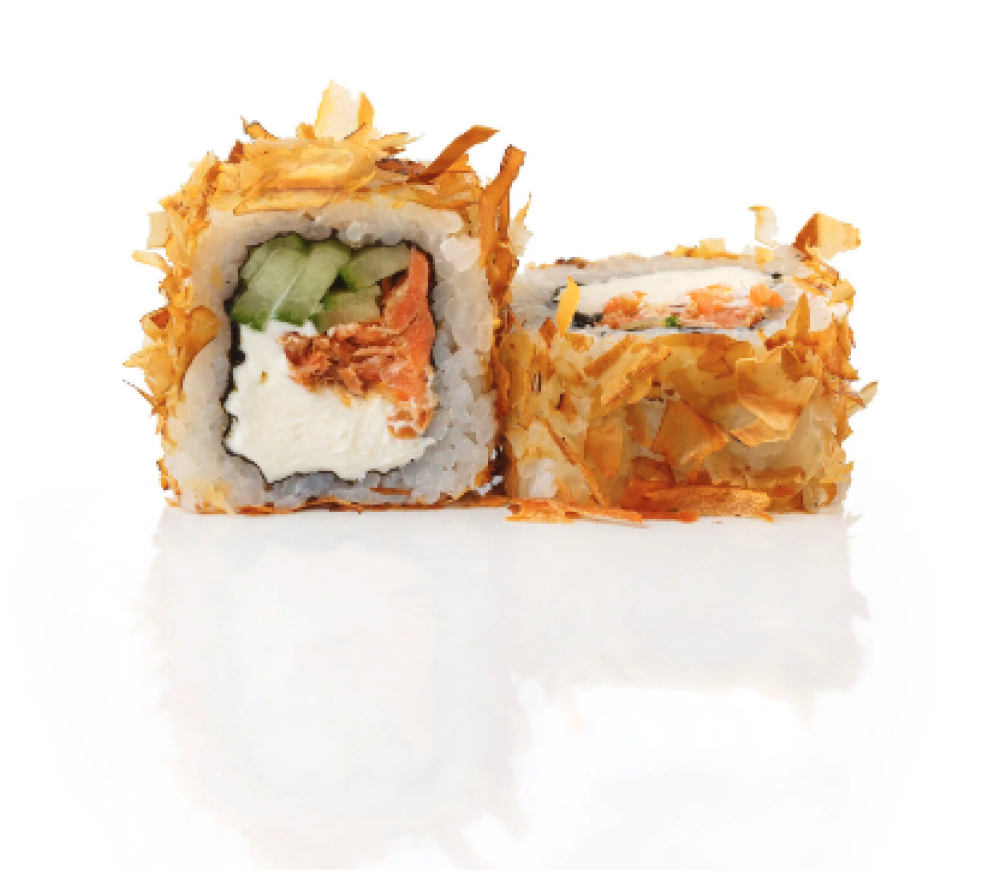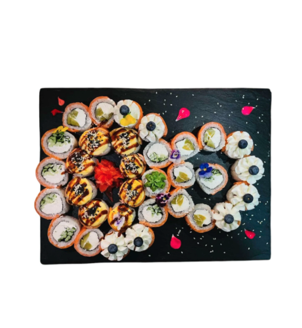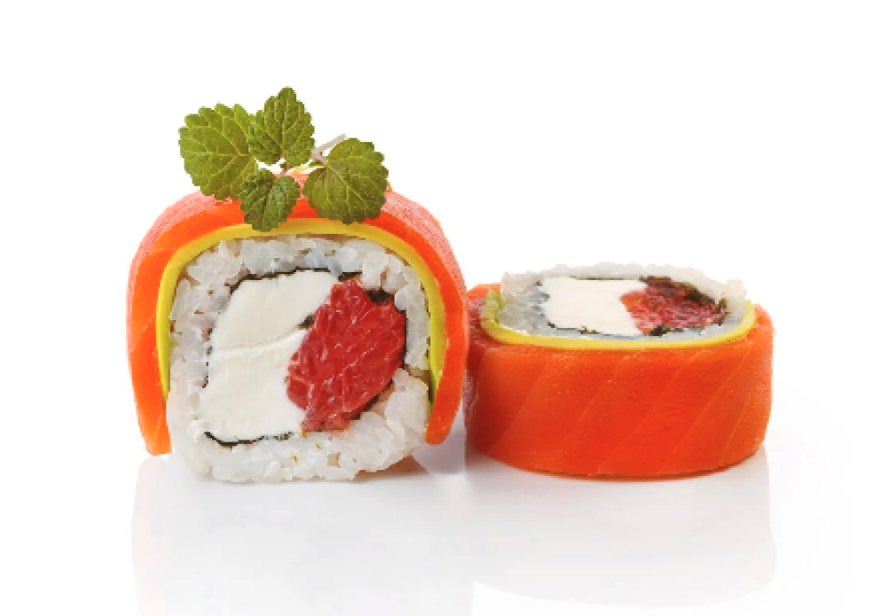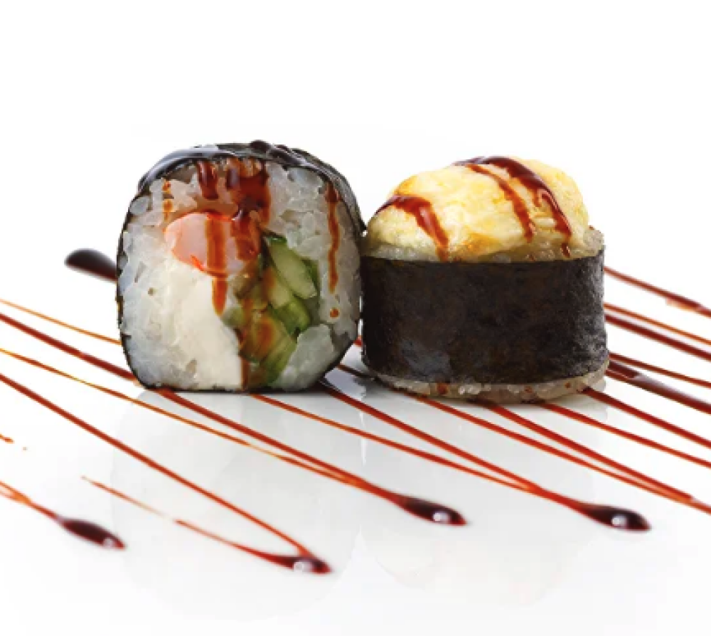 Ролл Темпура с лососем, Ролл с Тунцом и ананасом, Ролл Калифорния, Ролл Цундоку с беконом и соусом барбекю