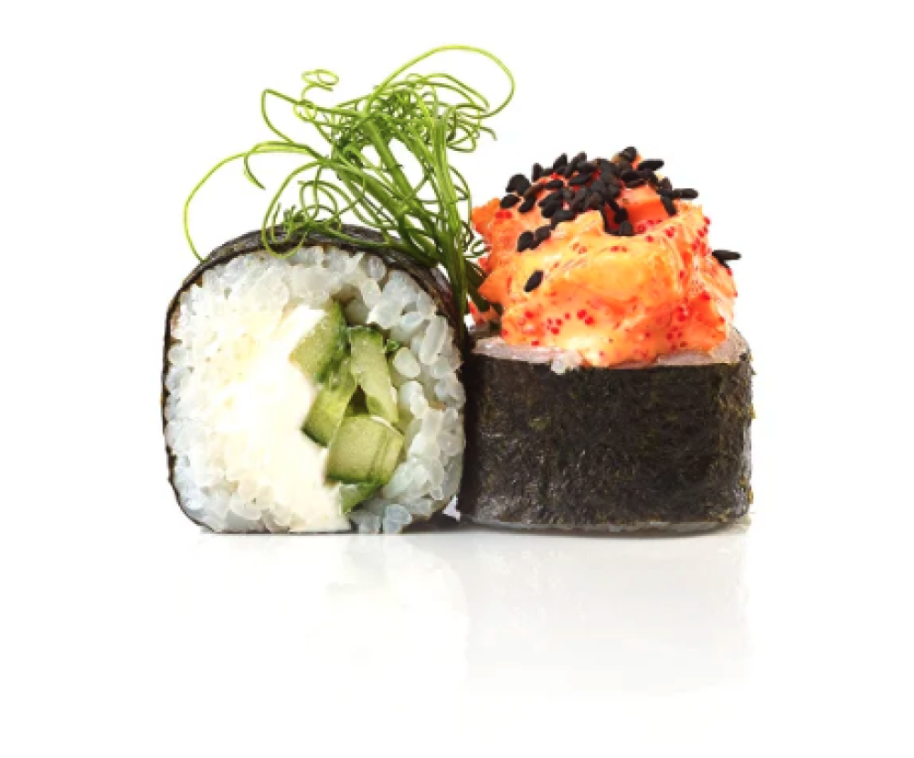 Ролл Харакири с битым огурцом, Ролл Спайси Лосось с острым перцем Пири-Пири, Ролл с авокадо, лососем и перцем чили в черном кунжуте, Ролл Сливочная Филадельфия с перцем чили