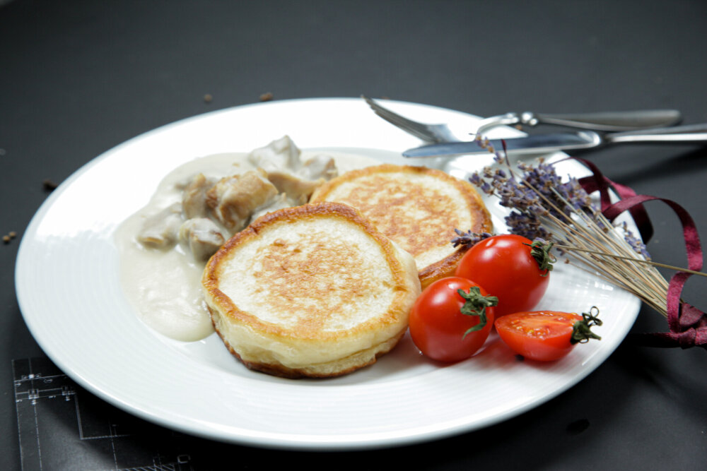Свинина, Масло подсолнечное, Соль, Перец чёрный молотый, Блины, Лук репчатый, Соус сметанный