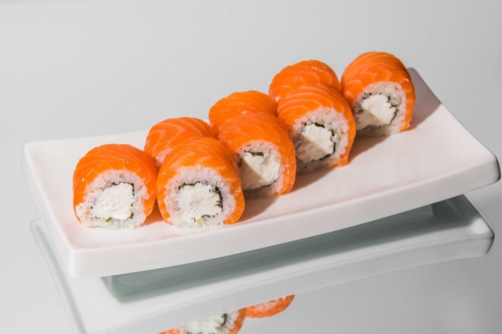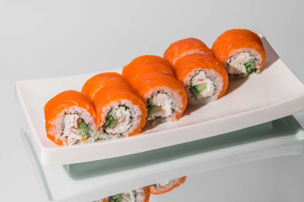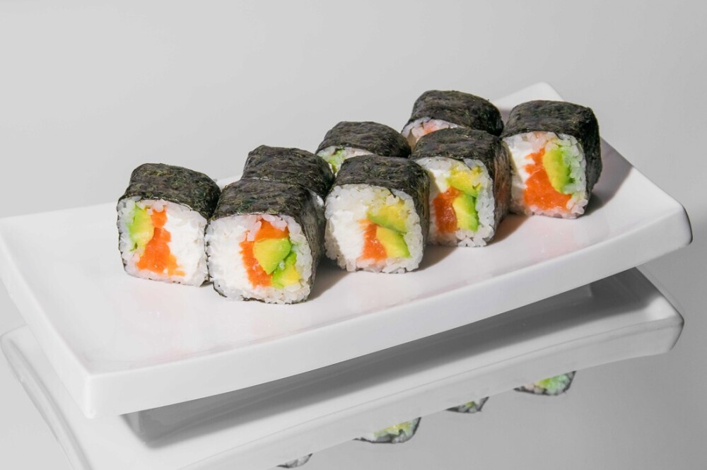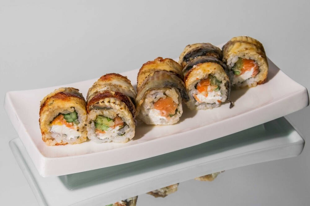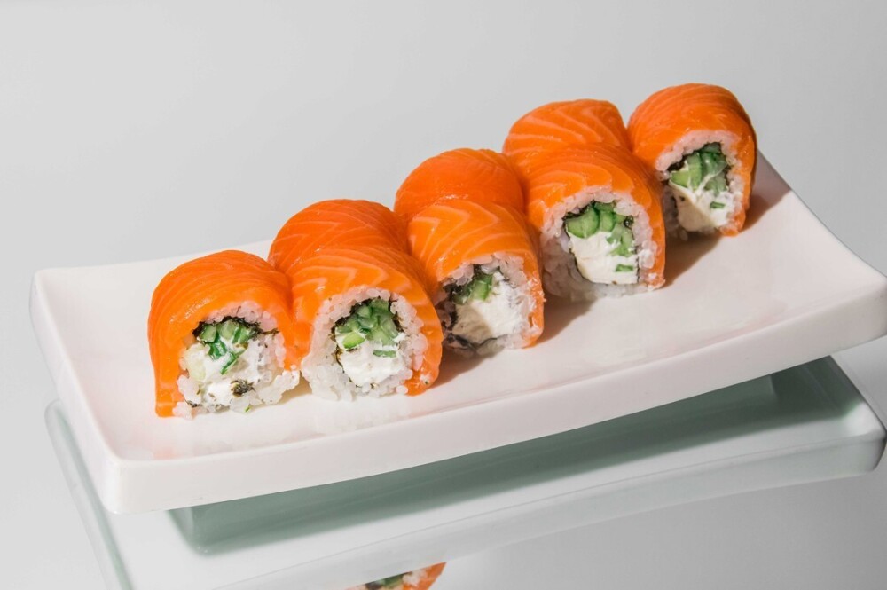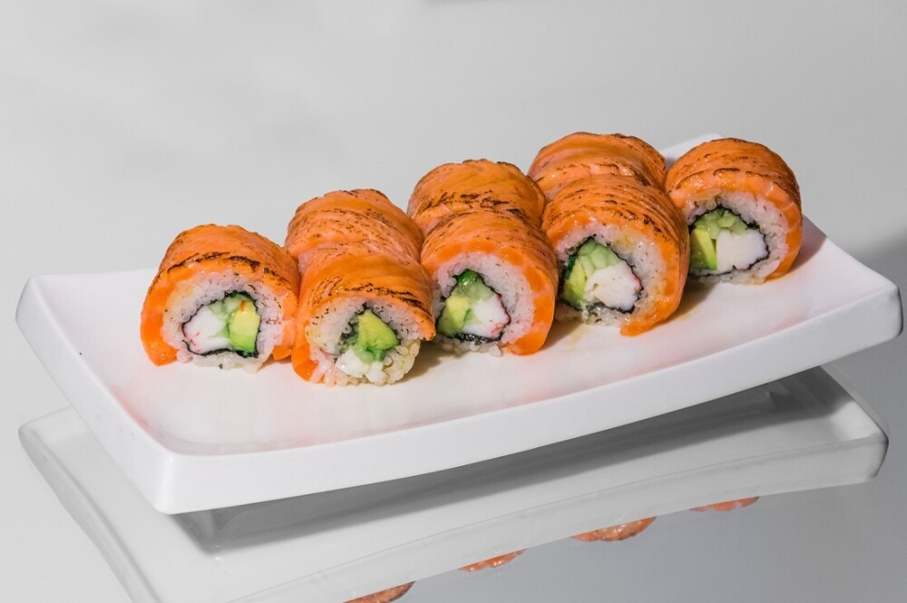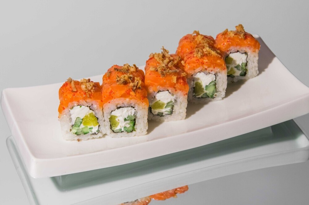 Жареный лосось, огурец, сливочный сыр, помидоры, такуан, икра тобико, соус терияки, рис, нори