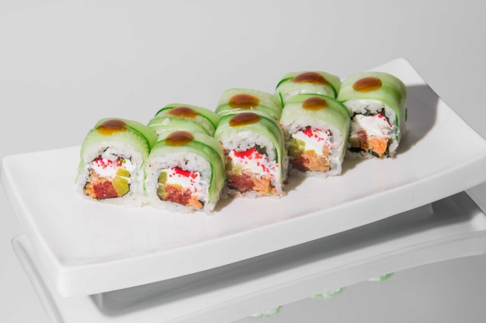 Угорь, лосось, огурец, сливочный сыр, рис, нори, соус грейпфрутовый