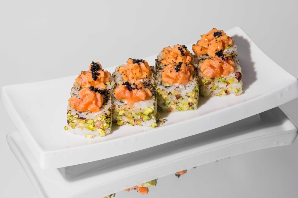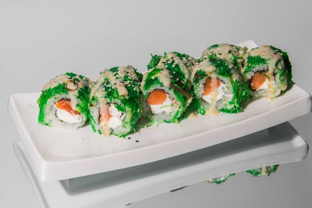Лосось, сливочный сыр, огурец, рис, нори, фисташки, соус грейпфрутовый
