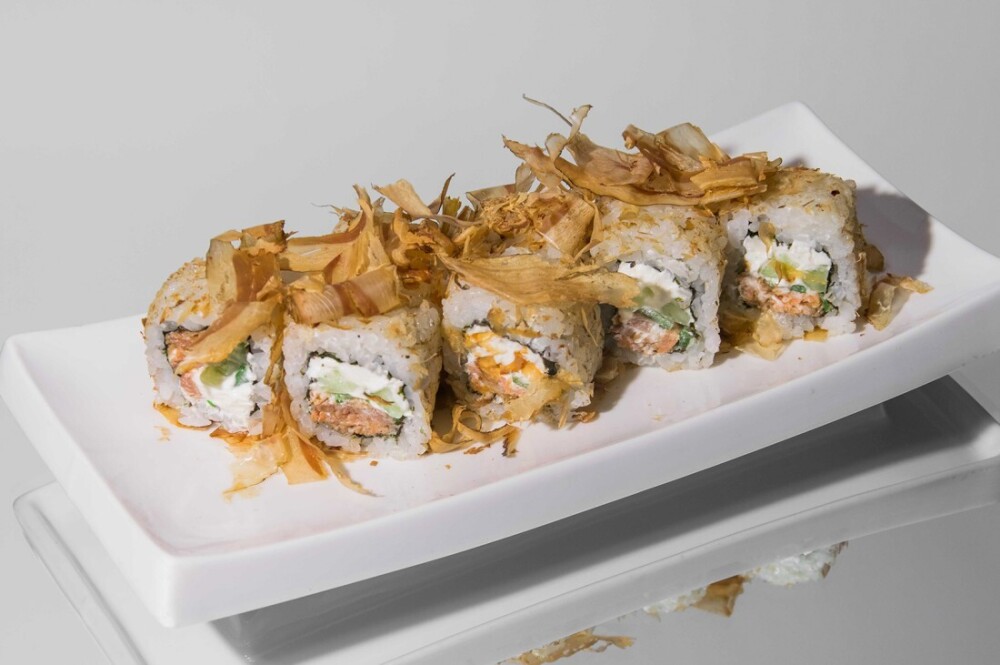 Лосось терияки, сливочный сыр, огурец, стружка тунца, рис, нори