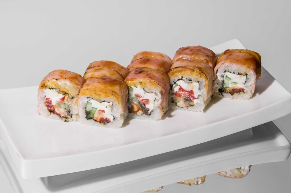 Угорь, бекон, сливочный сыр, огурец, помидор, соус терияки, рис, нори