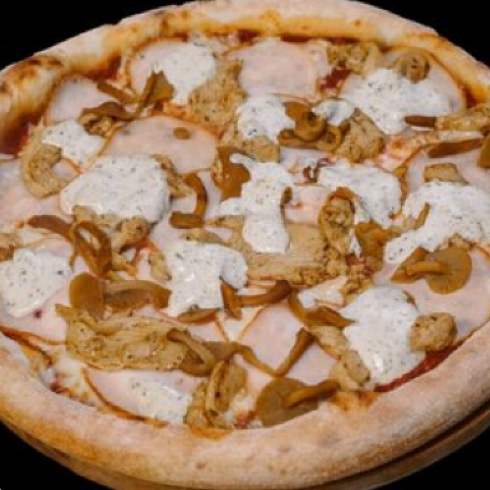 Тесто, томатный соус, сыр «Моцарелла», куриный рулет, куриное филе, грибы маринованные, сметанно-чесночный соус