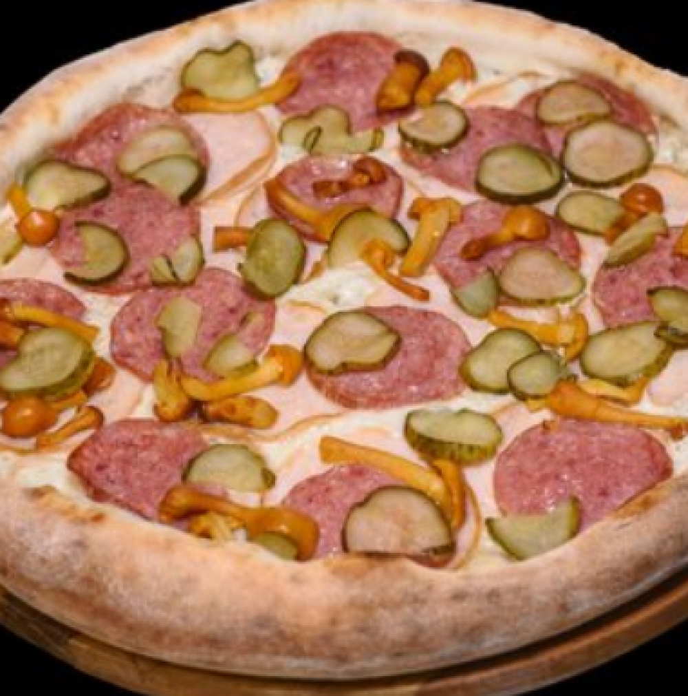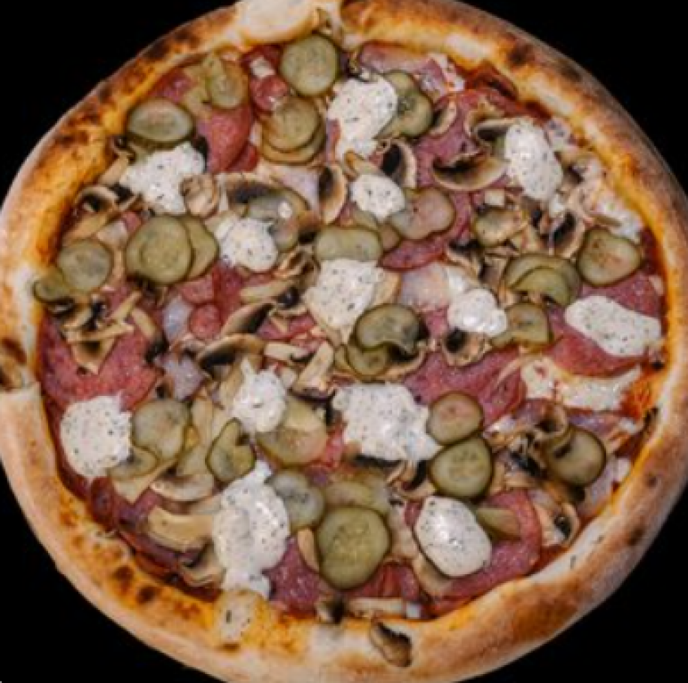 Тесто, соус «Томатный», сыр «Моцарелла», бекон сырокопченый, салями, колбаски охотничьи, шампиньоны свежие, огурец маринованный, сметанно-чесночный соус