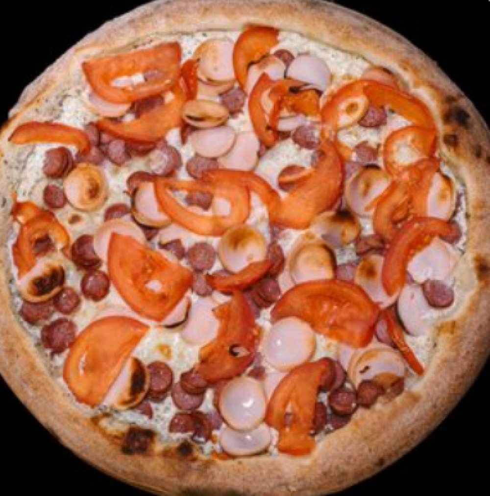 Тесто, сметанно-чесночный соус, сыр «Моцарелла», сыр «Фетакса», колбаски охотничьи, помидор свежий, яйцо куриное