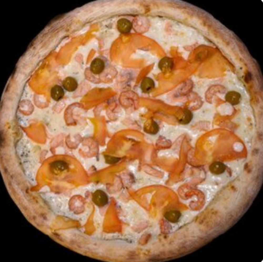 Тесто, сметанно-чесночный соус, сыр «Моцарелла», форель слабосоленая, оливки консервированные, помидор свежий, креветки салатные