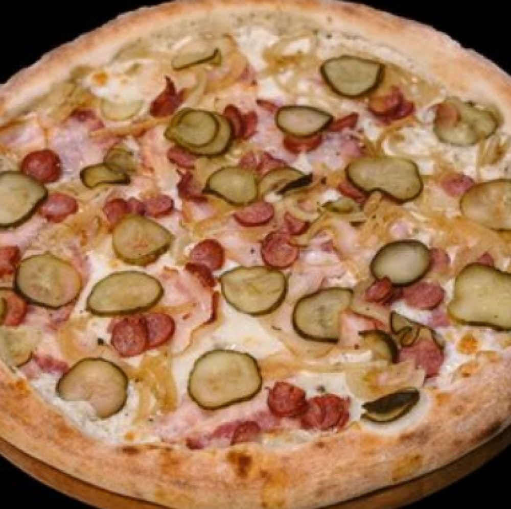 Тесто, сметанно-чесночный соус, сыр «Моцарелла», грудинка сырокопченая, колбаски охотничьи, лук, огурец маринованный