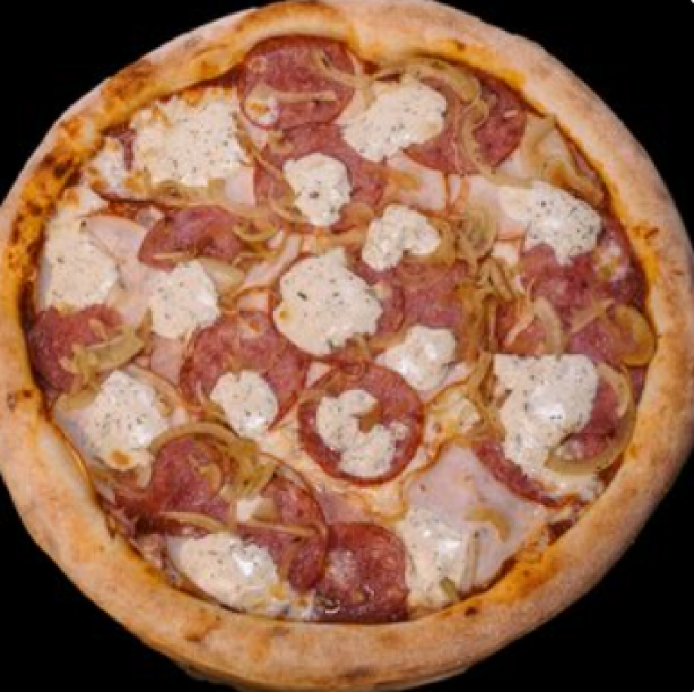 Тесто, томатный соус, сыр «Моцарелла», куриный рулет, лук маринованный, соус «Сметанно-чесночный», салями варено-копченая, ветчина варёно‑копчёная