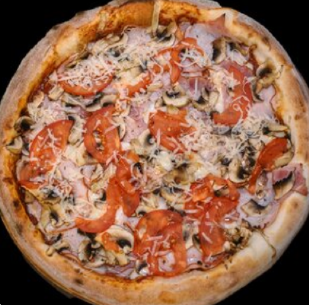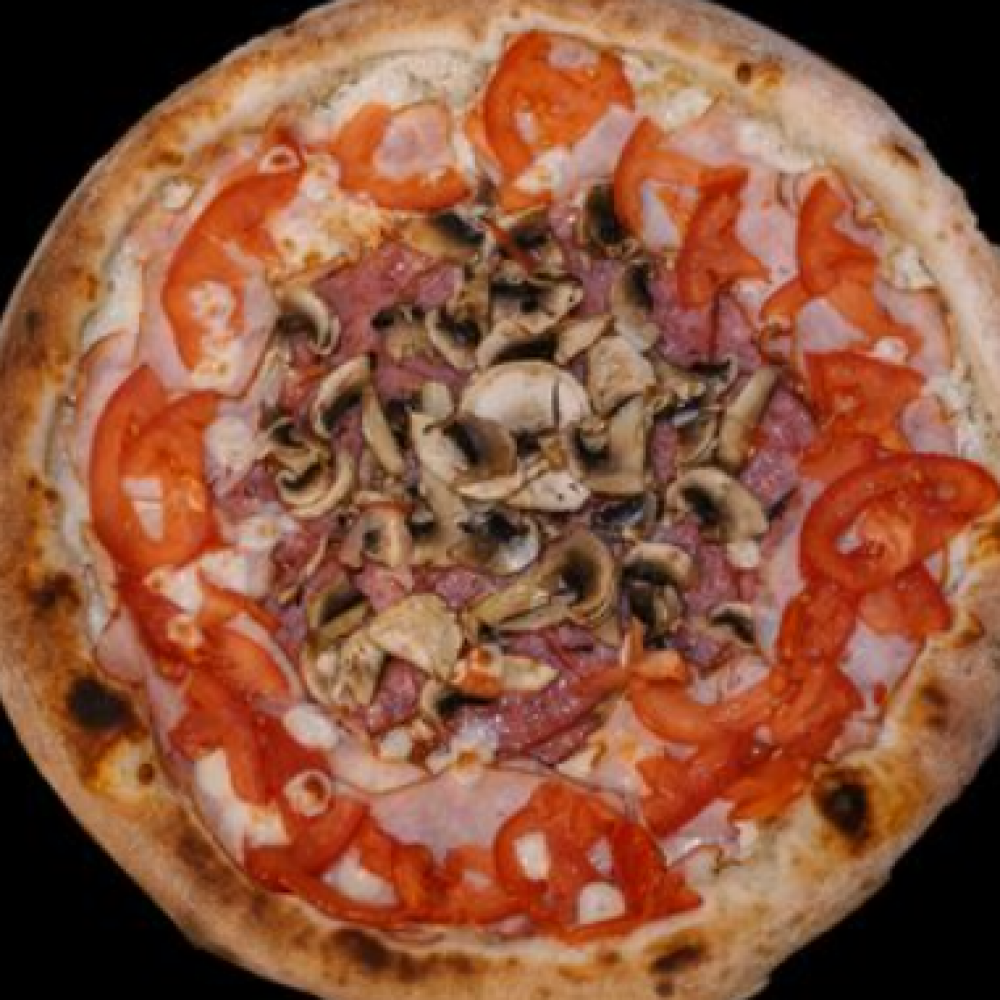 Тесто, томатный соус, сыр «Моцарелла», ветчина, шампиньоны свежие, помидор свежий, сыр «Пармезан»