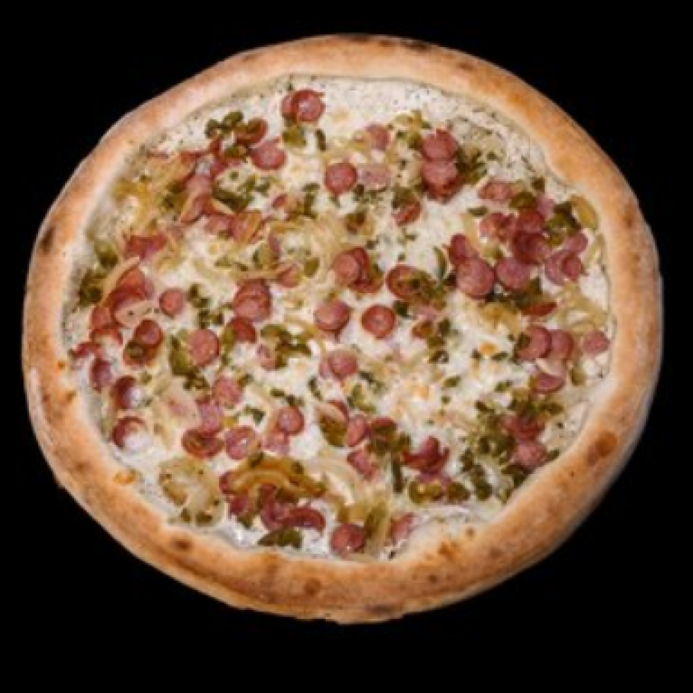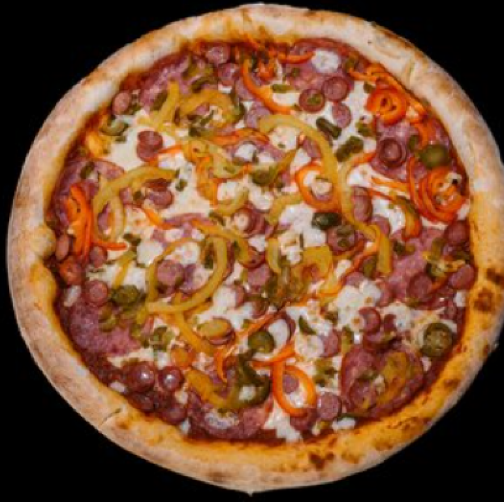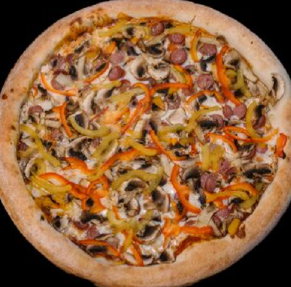Тесто, томатный соус, сыр «Моцарелла», салями варено-копченая, колбаски охотничьи, перец болгарский, перец халапеньо